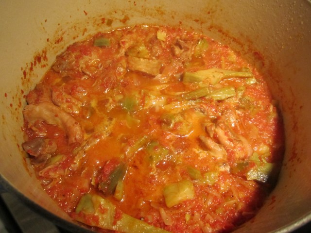 Add artichokes (no need to dry them–just pull them out of the lemon water and drop them into the dutch oven). Add wine and boil for about 2 minutes (no need to reduce wine too much). Add tomatoes.