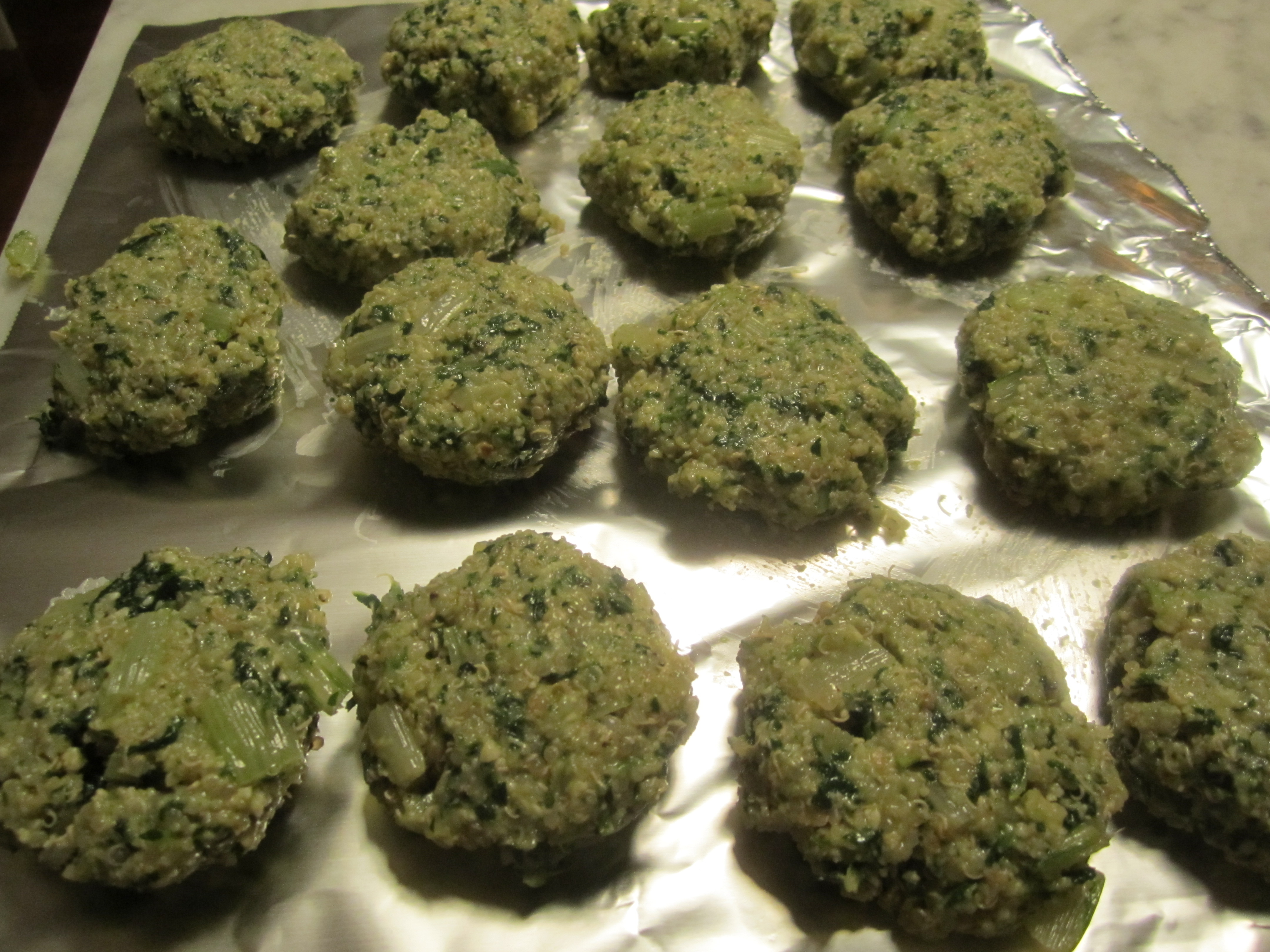 The method to making these fritters is very similar to that of meatballs, using the grain as a substitute for meat. Combine the cooked grain, swiss chard (cooked, chopped, squeezed), then add bread crumbs (a mix of plain and seasoned) to dry out the mixture sufficiently. Add cheese, parsley, black pepper, and salt. Taste and add more salt if necessary. Add the eggs and mix well with hands. form into balls and flatten. Fry in olive oil and eat at any temperature! They also freeze well–just reheat in a 300 degree oven on a sheet of foil for 15 minutes.