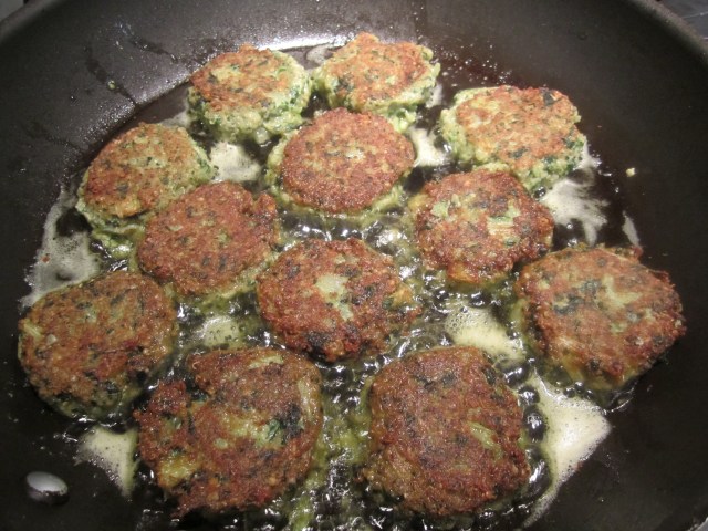 These are great hot, warm or cold. I generally fry the whole batch, eat some hot, then refrigerate or freeze the rest in foil. Although this evening, I served mine with the arugula, tomato and goat cheese salad in the opening photo, they’re brilliant by themselves as a cocktail snack.