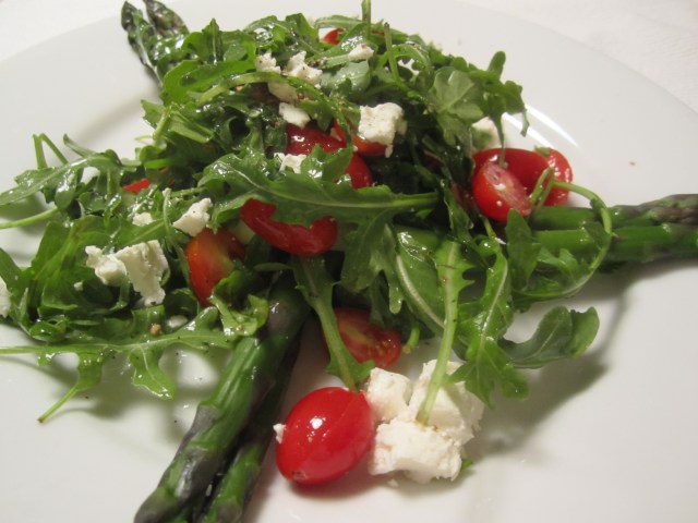 As a first course to the tripe and polenta, I’m serving the salad below–local asparagus, arugula and tomatoes, simply dressed with olive oil and lemon.