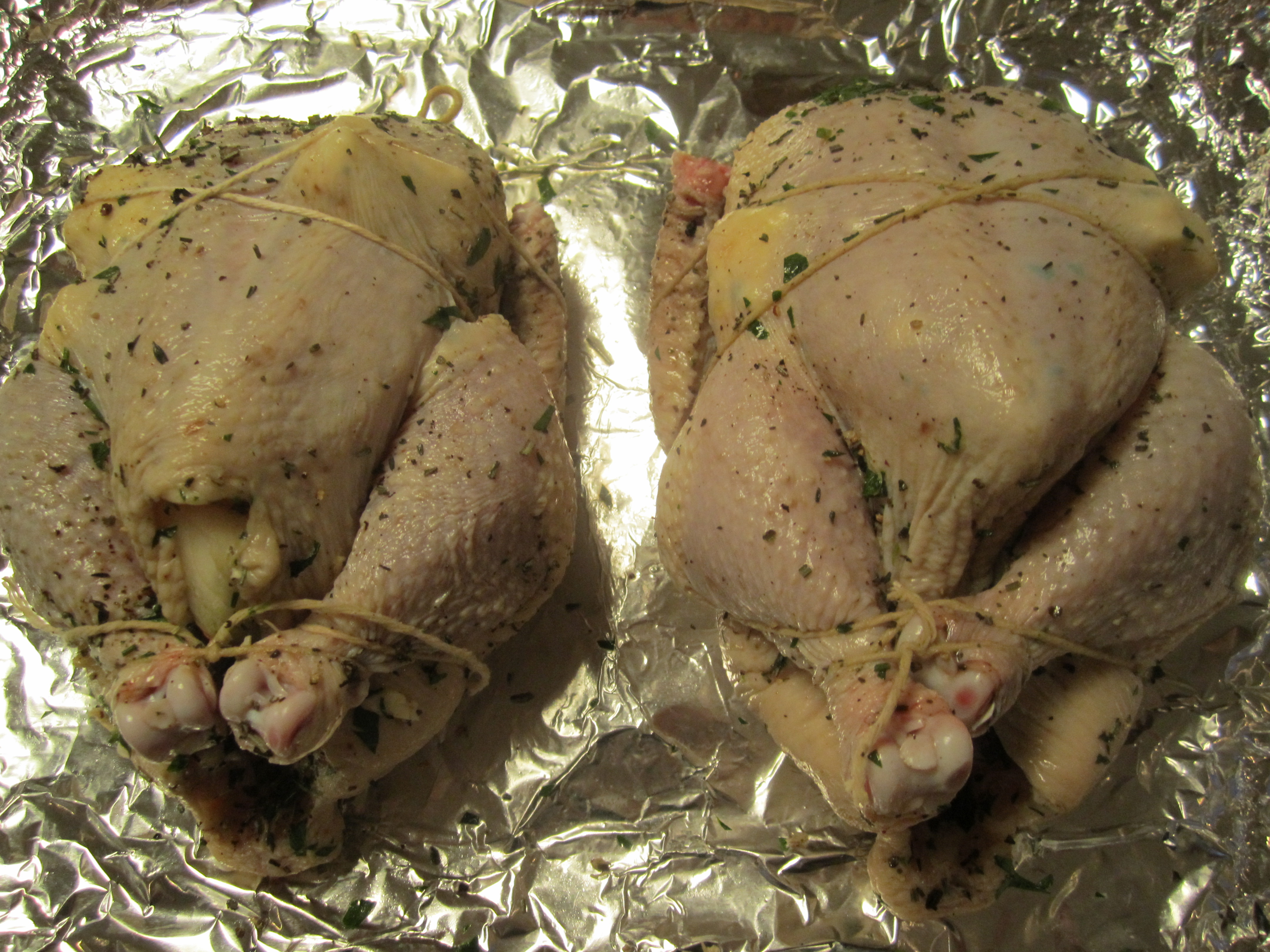 The chickens I was going to grill have been marinating all afternoon, in a mix of thyme, rosemary, parsley, lots of salt, pepper and olive oil. I’ve stuffed their cavities with some shallots and the branches of the thyme and rosemary.