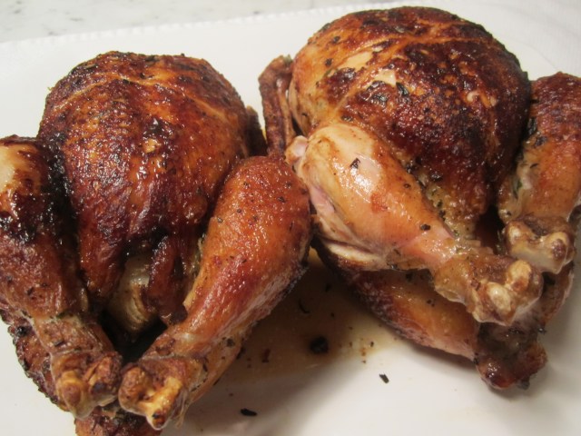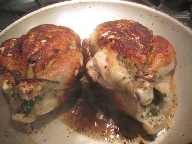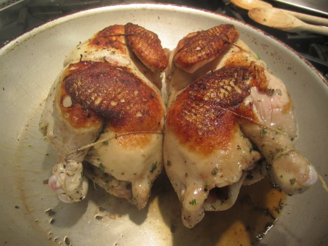 I only allowed myself an hour to make these chickens, so I had to do some fast last-minute strategizing . . . the fastest way to roast a chicken whole while still getting a nice mahogany brown exterior is to do what many professional chefs do–first sear it on the stovetop, then roast it in a 450-degree oven for about 45 minutes. This is the way those kitchens always turn out roast chickens that are so brown and gorgeous.