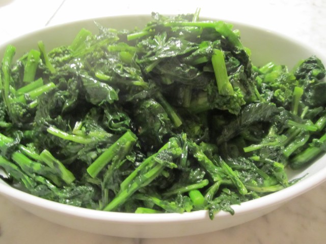 I’m serving my chicken with some sauteed broccoli di rapa, with garlic and chili flakes (see my prior post for the recipe), as well as skillet potatoes (you’ll also find that recipe in my earlier “dinner for one” post).