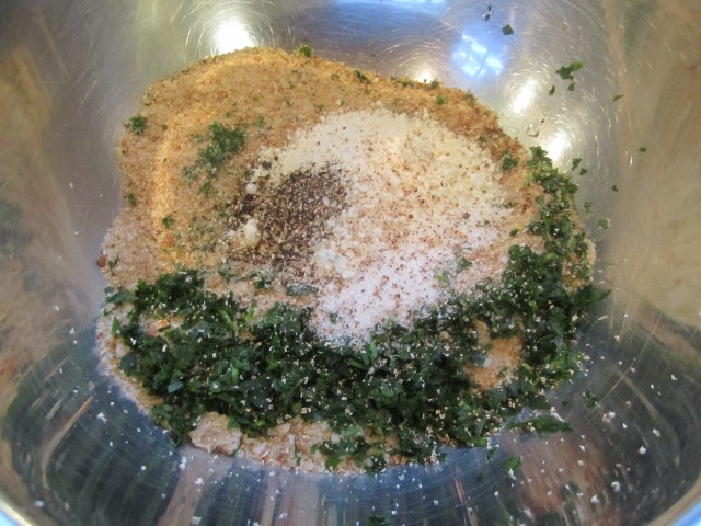 When I want to make seasoned crumbs, I take some out and put them in a mixing bowl. I add chopped parsley (washed and allowed to dry in a kitchen towel for several days in the fridge before chopping), salt, pepper, grated cheese and nutmeg. It’s a worthwhile exercise (although I still occasionally resort to seasoned crumbs from my local gourmet market “Citarella”).