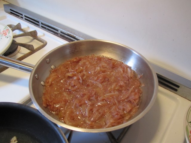 In a nonstick skillet, heat 2 tablespoons of olive oil and saute the onions on low heat for about 15 minutes. Add red wine and continue cooking very slowly for about a half hour, partially covered, stirring from time to time. By then, the onions should have reduced and become deeply sweet and scented with wine.