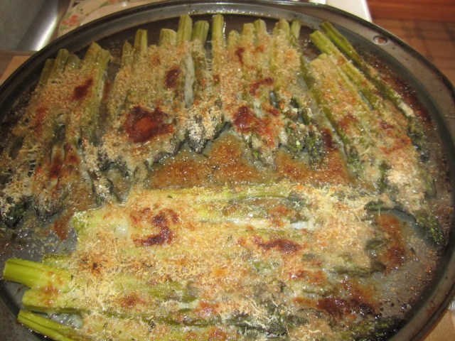 In addition to liver and polenta, Beppi has made a special spring side dish–asparagus gratinate. The asparagus are peeled, boiled, sprinkled with breadcrumbs and grated parmiggiano, then dotted with butter and broiled. This is a wonderful side dish with just about anything!