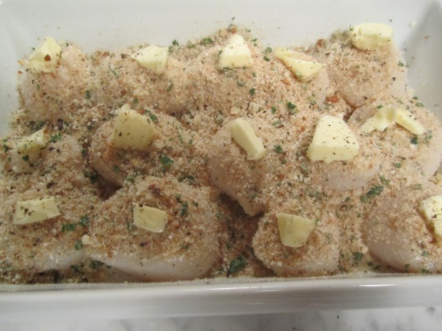 Butter the baking dish, lay out the scallops in one layer, then sprinkle with crumbs, some grated parmiggiano and dot with butter. Bake at high heat, then broil until golden and blistering.