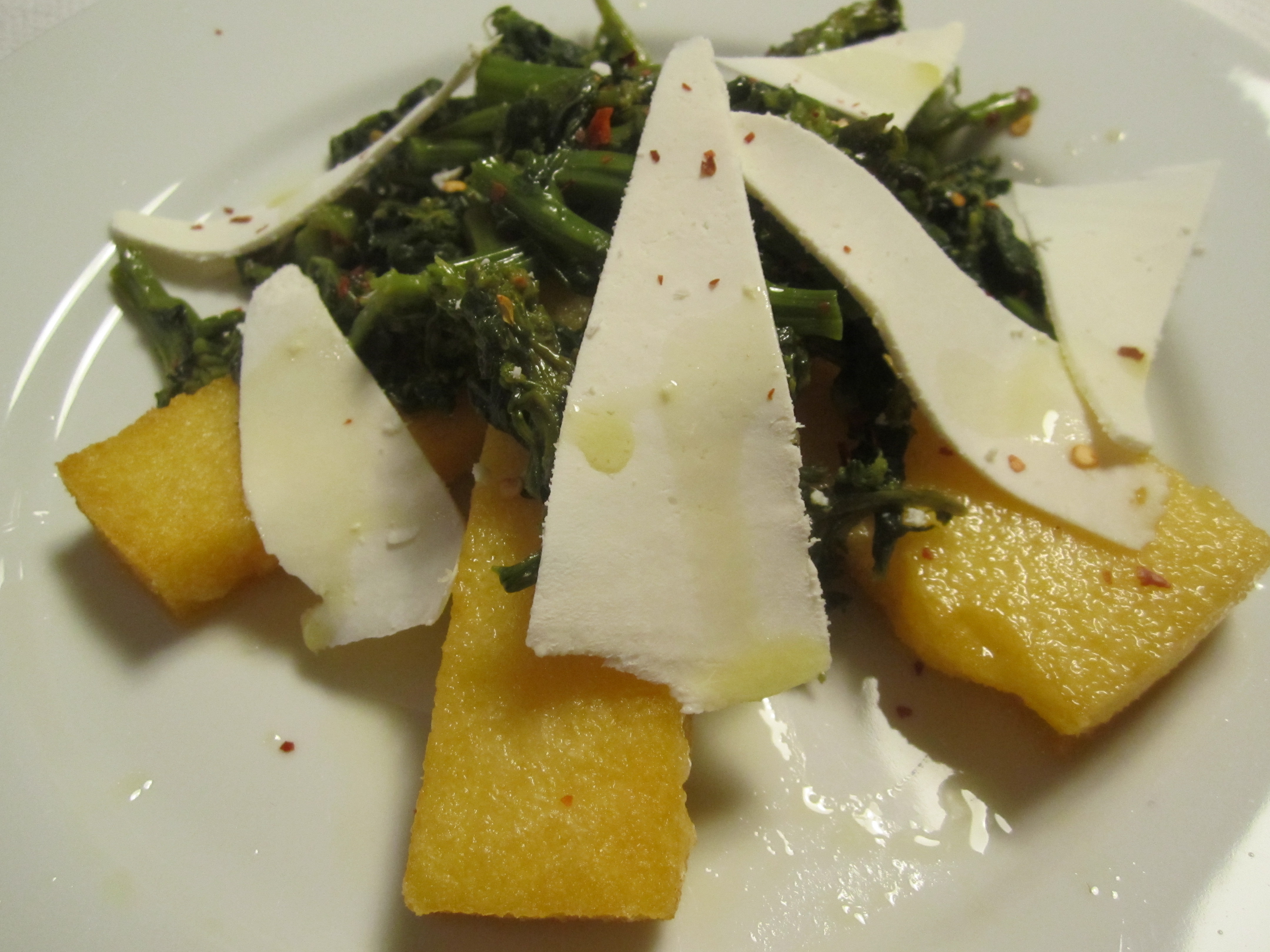 The greens and ricotta salata would go equally well over a piece of bruschetta or a bowl of pasta, for that matter, but try the crispy fried polenta sometime–this is a great antipasto–you can make the polenta ahead, cook the greens ahead and serve them at room temperature. the only last-minute thing to do is fry the polenta.