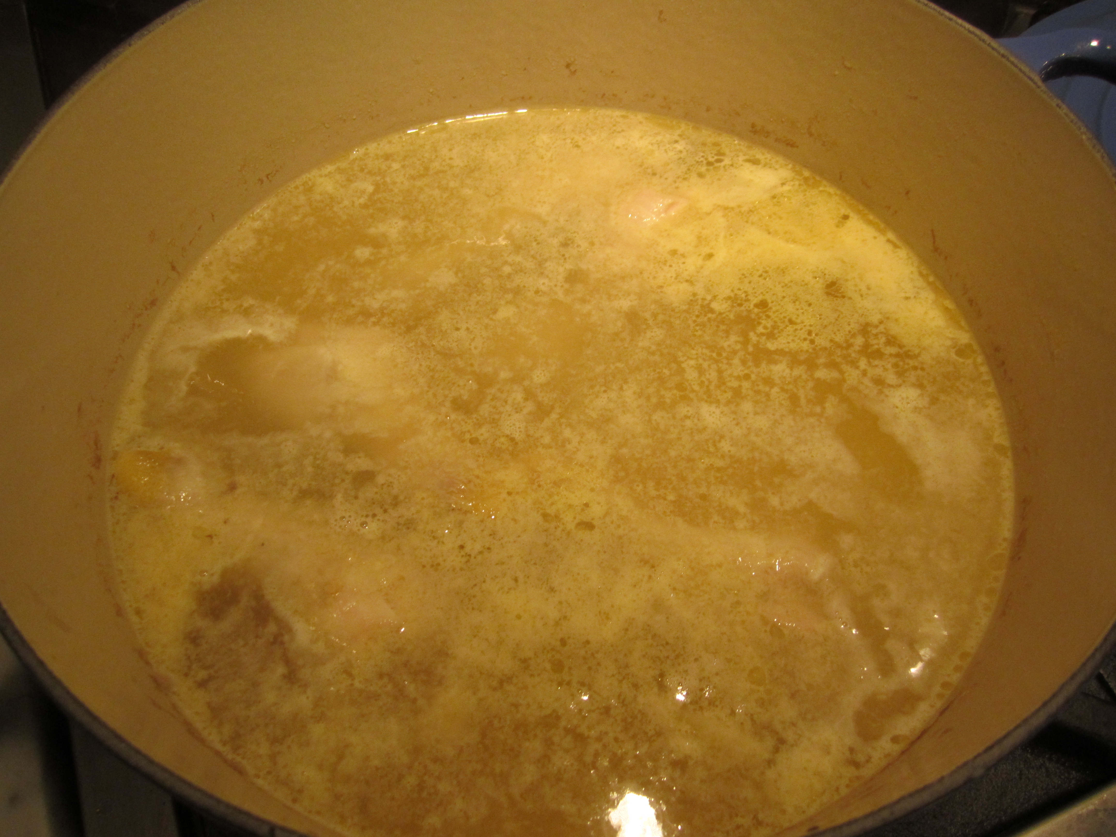 Place chicken in stockpot or dutch oven and cover with water by about 2″. Bring to a simmer and remove froth that accumulates as the broth simmers. Simmer for one hour, then taste and add salt.