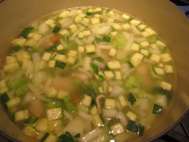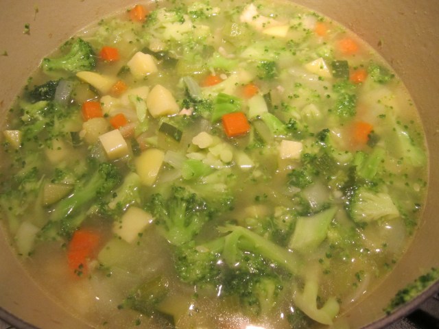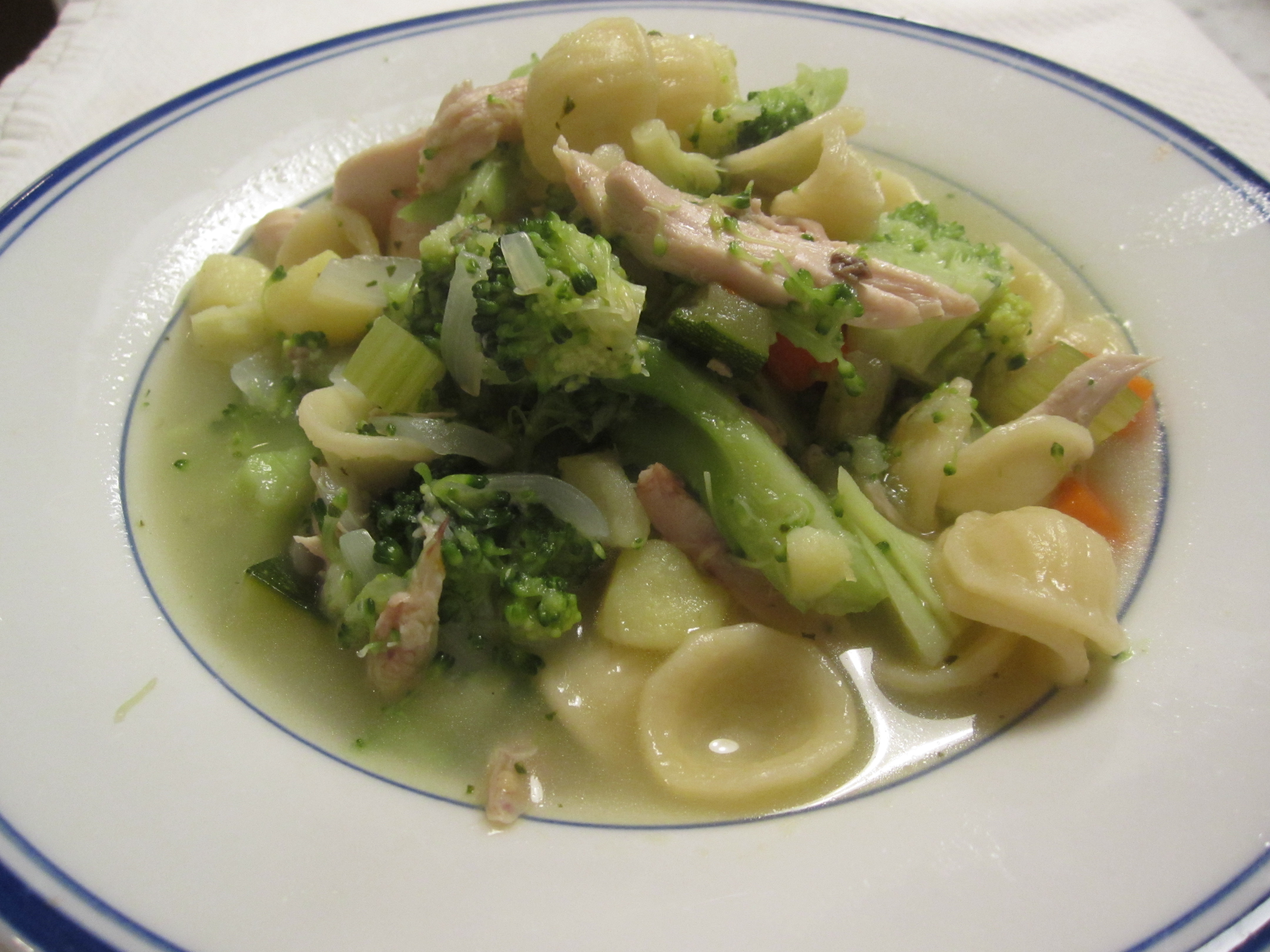 I made a chicken broth with drumsticks. To the chicken broth, I’ve added celery, onion, potatoes, carrots, broccoli and parsley stems. The broccoli gets chopped finely, then simply added to the broth at the last minute, along with some cooked pasta (orrechiette or mezzi-rigatoni.