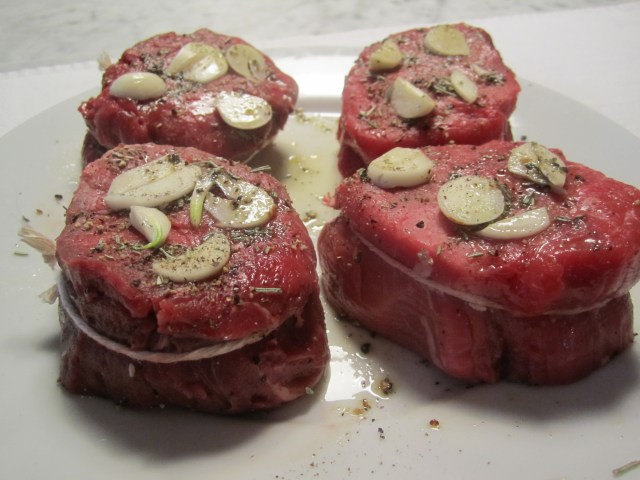 First, preheat the grill and rub the filets with a little sliced garlic, rosemary and oil and allow them to sit at room temperature while you prepare the rest of the meal and the grill heats up.