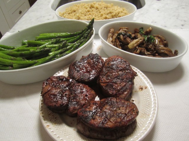 While the steaks are grilling, cook the asparagus: no peeling or blanching tonight (they’re all pretty skinny spears, anyway). Just bend the spears, snap them in half (where they want to break) and wash them in a bowl of cold water. In the same skillet in which you cooked the mushrooms, on high heat, add in 2 tablespoons olive oil, the zest of half a lemon, and 4 tablespoons water. It will boil in a minute–add in the asparagus, cover and saute on high heat for about 3 minutes, lifting the lid and stirring from time to time. Uncover and allow the water to evaporate. Taste and add salt and black pepper. They are done when stalks are crisp-tender (about 5 minutes total).