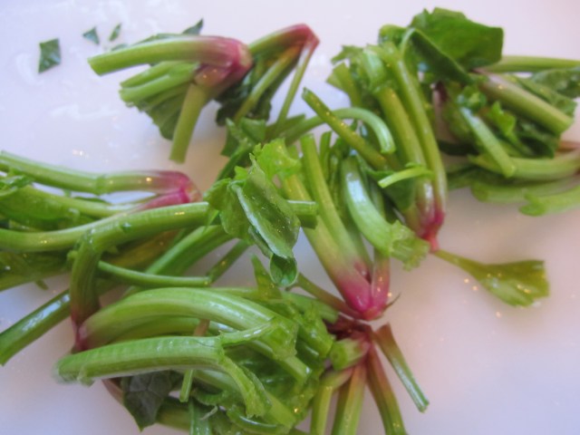 She then donned an apron and into my boiling salted water went the stems. She boiled those stems for about 8 – 10 minutes, then drained them. She said she was going to make something special for me after I finished boiling the leaves.