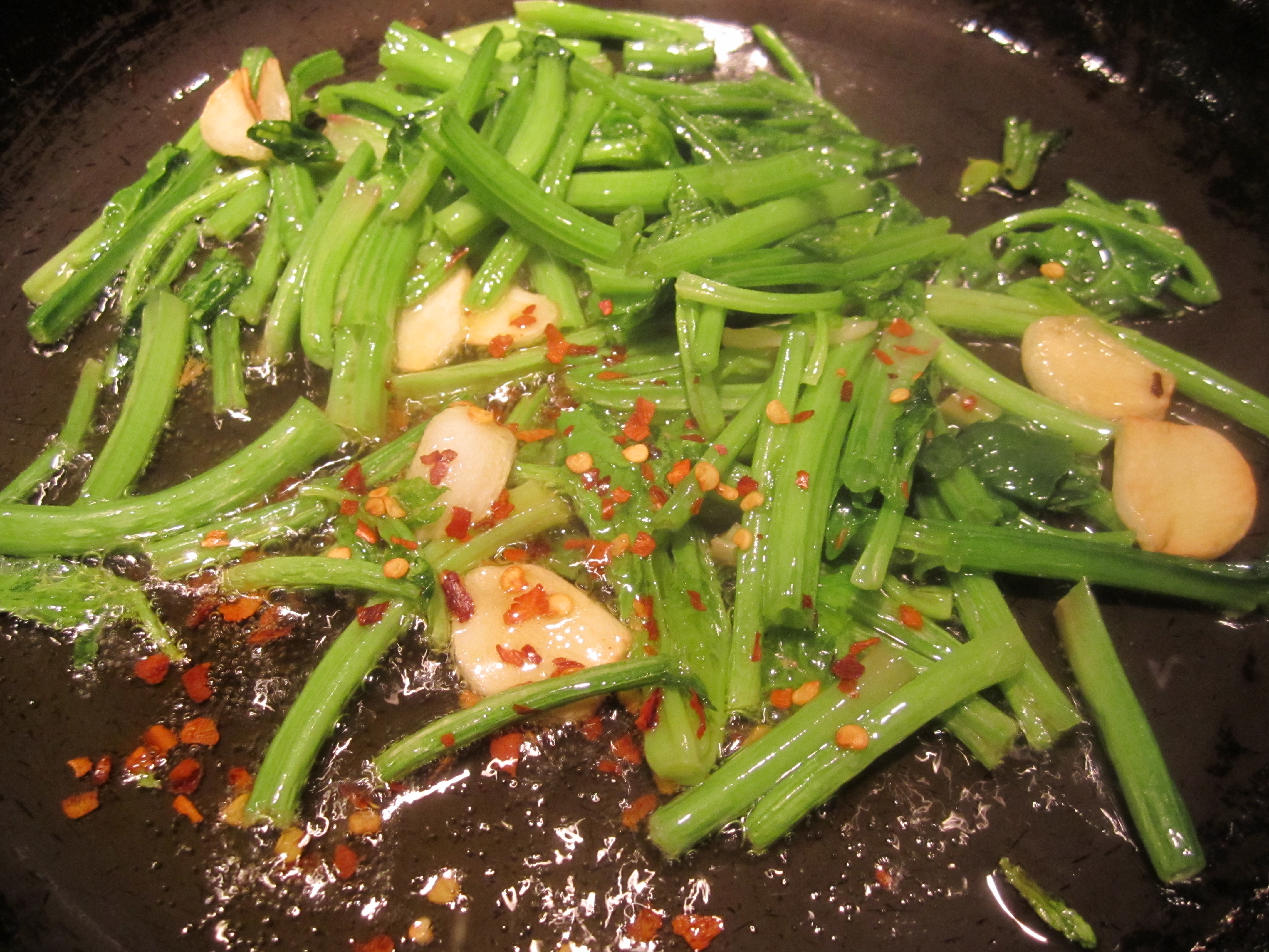 After draining the stems (no squeezing necessary–just drain in a colander), she sauteed some garlic and chili flakes and some cubes of stale bread in olive oil with the spinach stems. The stems were was sublime–bright green and much more delicate than the leaves–with none of the irony aftertaste on the palette.