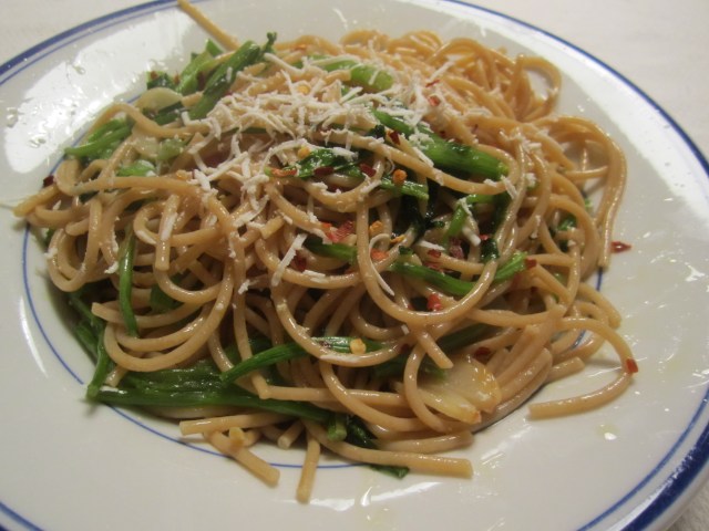 Into a skillet with some browned sliced garlic throw the raw stems and saute while the pasta is boiling. I’m using whole wheat spaghetti because I love it with any garlic-and-olive oil preparation. It’s earthy flavor is the perfect complement to the bright green flavor of the spinach and the earthiness of the garlic and chili flakes. Topped with a little ricotta salata for milkiness, this dish is fine enough to serve to guests.