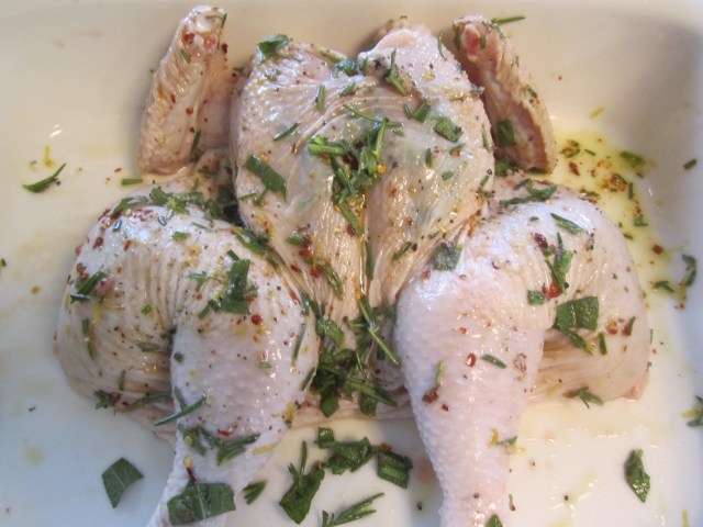 Next, open the chicken and turn it over breast side up. You should be able to flatten it out by pressing down ont the breast. Next, prepare the marinade–in a large baking dish, combine sage, rosemary, lemon zest and juice, olive oil, salt, pepper and chili flakes.