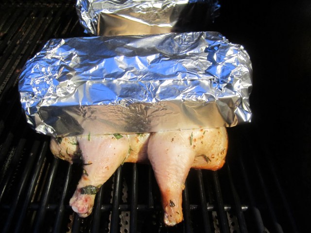Preheat grill and place flattened chickens, skin side up, over high heat. Place a foil-wrapped brick on top of each chicken and turn heat to medium. Cover grill and allow to grill undisturbed for 25 minutes. Check on them every few minutes to make sure there are no flareups–if there are flareups, quickly squirt with some water to extinguish.