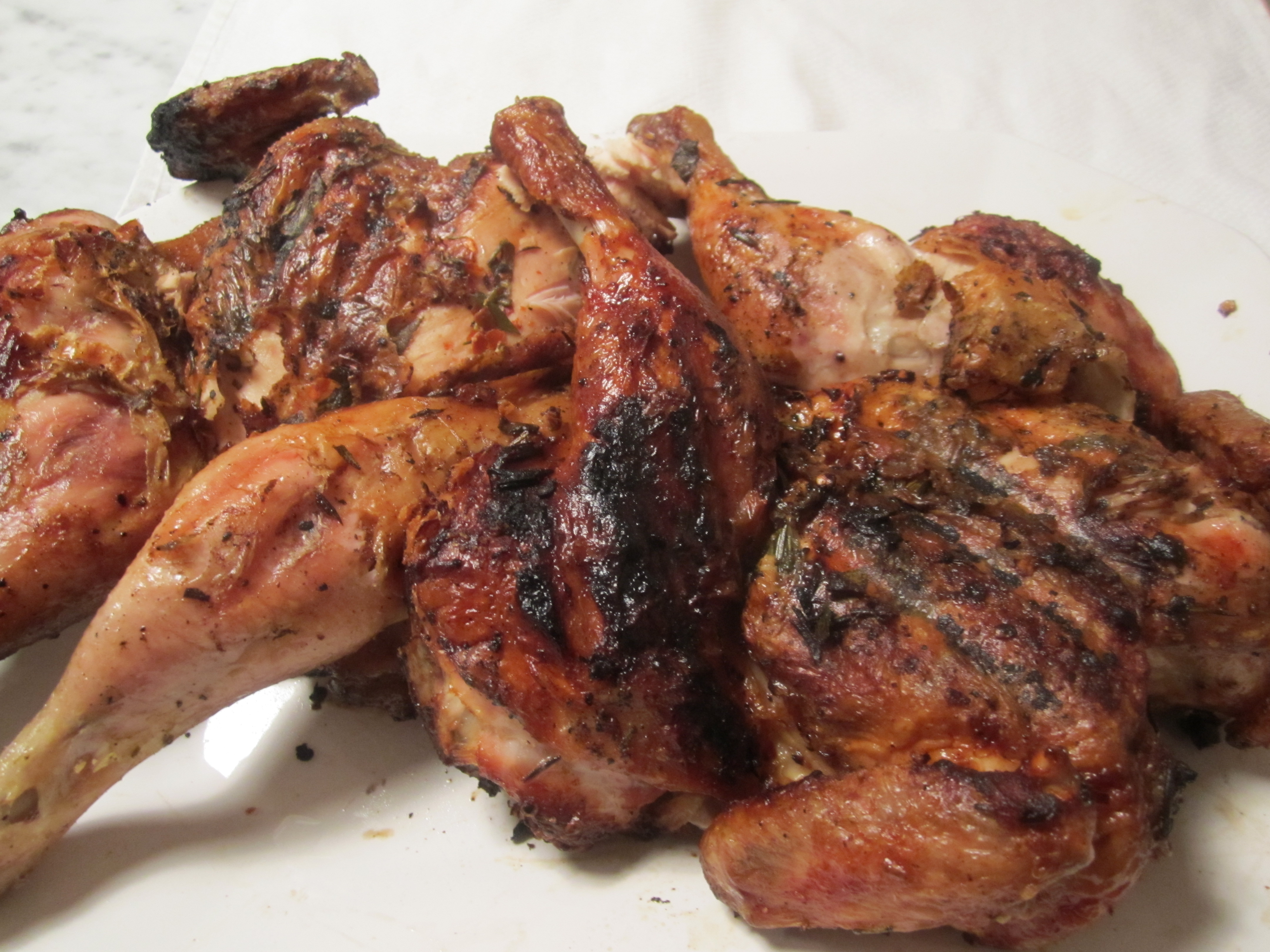 This dish is known in Italy as “pollo sotto il mattone”. It’s a great technique for getting the maximum amount of crispness and grilled flavor from a chicken. It works best with smaller chickens (under 3 lbs) or–better yet–cornish hens or poussins.