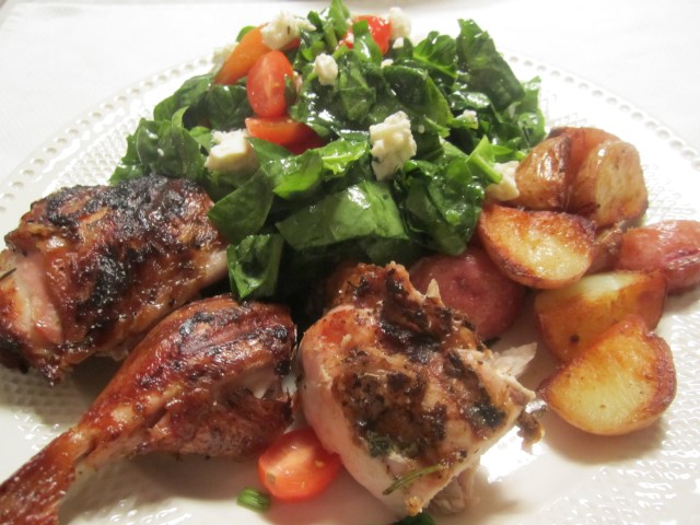When ready to grill, you’ll need about an hour of grilling time from start to finish. I always like potatoes and a salad with grilled chicken, so tonight we’re having skillet potatoes and a spinach salad. I could eat this meal a couple of times a week!