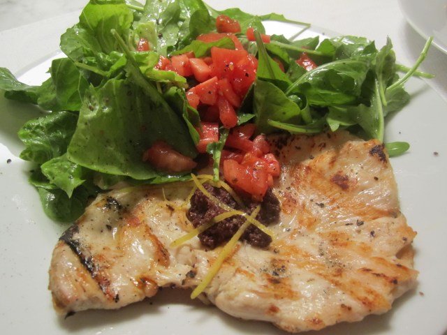 Make sure the grill is on high and super-hot. Grill each breast for a total of about 5 minutes and remove. The tapenade is simply placed on the hot breast once it comes off the grill, along with some lemon zest. On top is a salad of lettuce and arugula dressed with oil and lemon, along with some chopped tomatoes. Summer’s here!