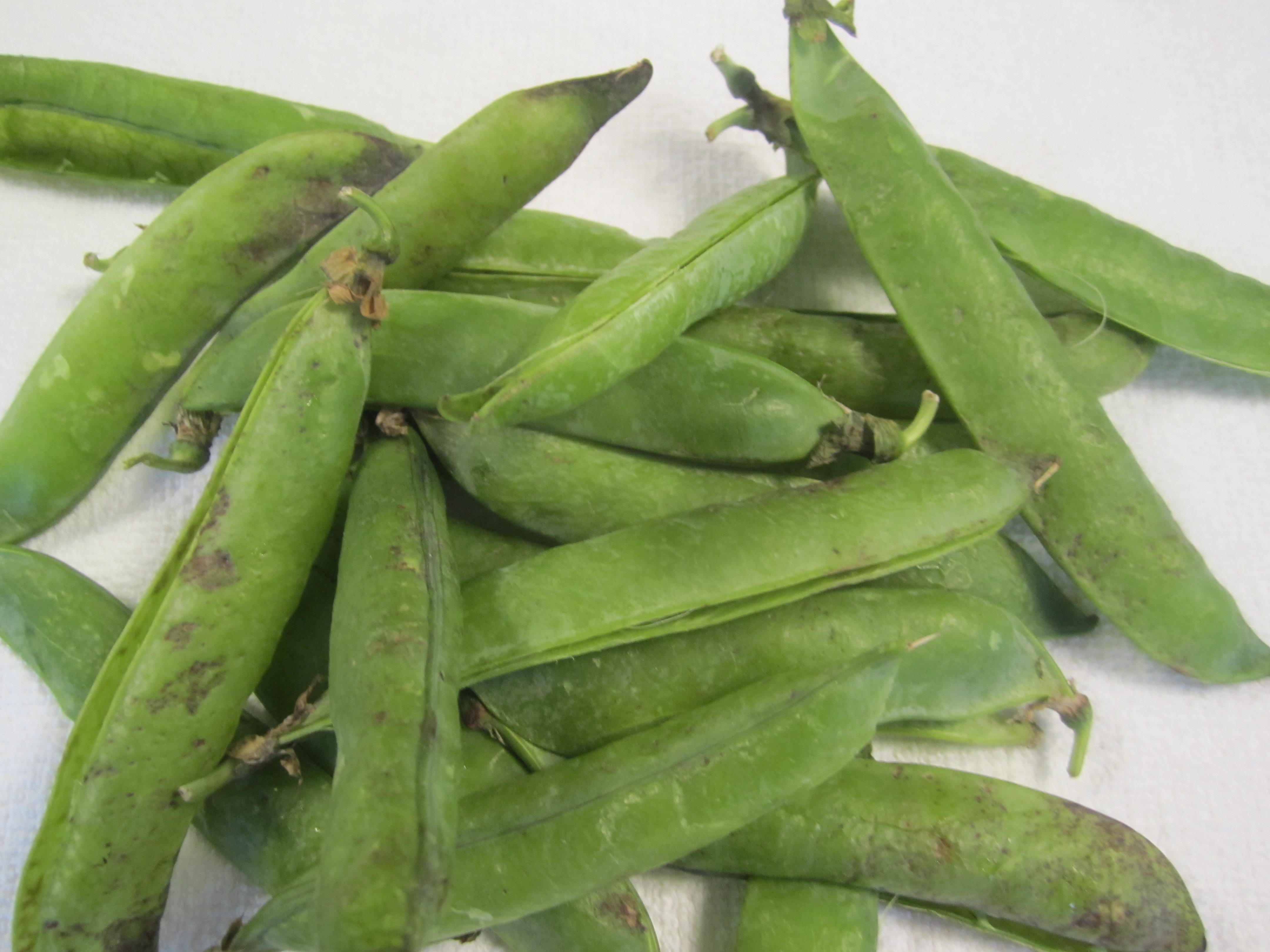The labor of making peas begins with the selection process. You should always buy them where you can touch and squeeze each pod–if the pods are pre-packaged, you might not be getting a consistent product. You can’t always tell by looking at the pods whether the peas inside are plump and worthwhile. Like fava beans, you want pods that feel full of nice fat peas–not half-empty pods or pods that look plump and round, but only have tiny peas inside. The yield of peas to pods is small, so you generally want to buy a lot (2 or 3 lbs of pods) even if you’re only cooking for four. Therefore, you’ll be standing over the bin of peas for a while and squeezing each pod before you select it.