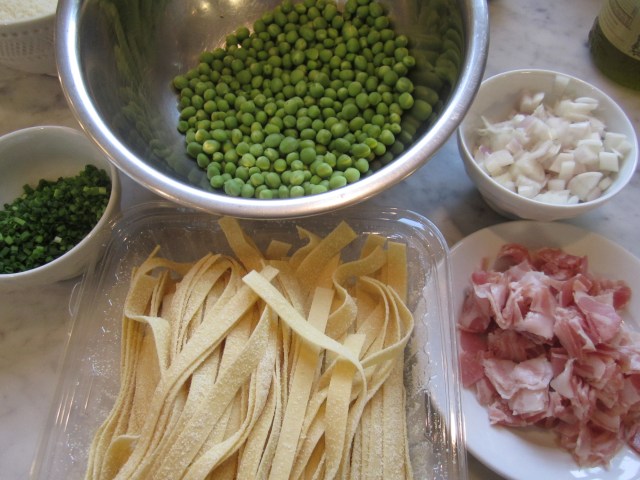 Once the peas are shucked and blanched, you’re ready to assemble the rest of the ingredients and cook the pasta. The pancetta is thinly sliced, then diced; shallots are chopped and set aside.