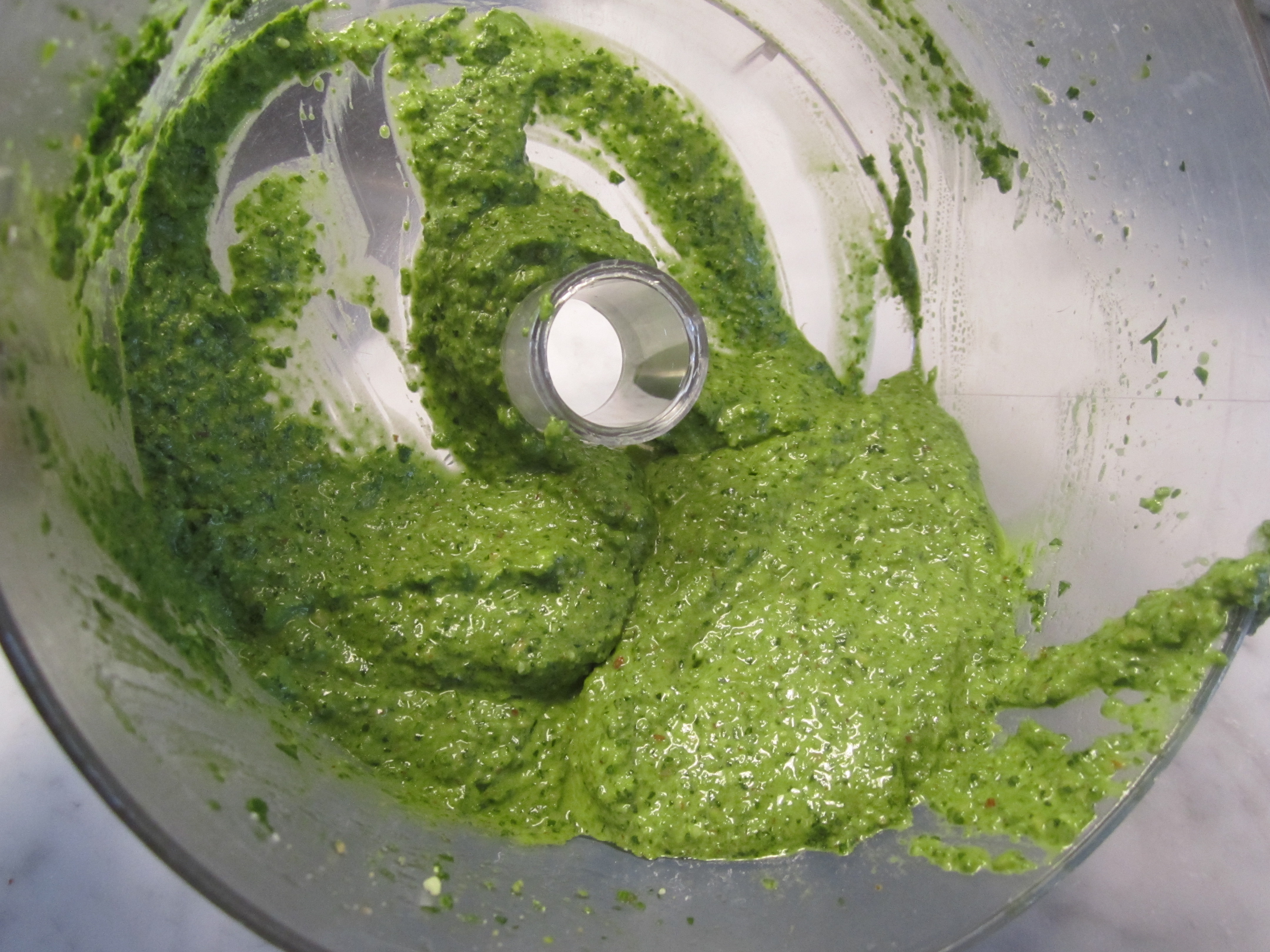 This pesto has a wonderful smokiness and intense green color, and it doesn’t blacken easily. There’s only a touch of basil, but lots of baby spinach. The predominance of spinach makes for a milder, more subtle green flavor than pesto made entirely with basil. The smoked almonds and pecorino romano add a strong, salty bite. Together, they eliminate the need for added salt.