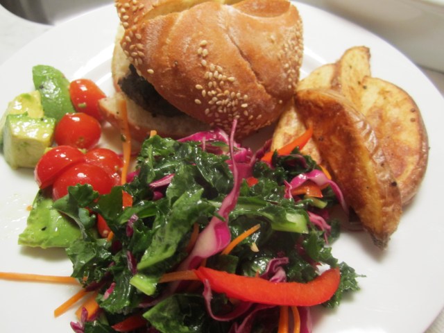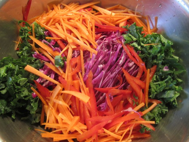 When I make burgers, I’m always looking for a good raw vegetable salad that’s not just cabbage and mayonnaise–although I like that from time-to-time. Today’s slaw is sweet, crunchy and vibrantly colorful, with deep green ribbons of kale, julienne of red cabbage, red peppers, and carrots. I’ve made it a couple hours ahead to allow the flavors to meld and the volume to decrease a bit. The dressing on the slaw is simply extra-virgin olive oil, rice wine vinegar, agave and lemon juice. The rice wine vinegar gives it the perfect mild acidity, without making it overly tart.
