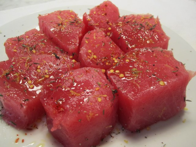 I like to rub tuna with some Meditteranean herbs an hour or so ahead of cooking (no salt or acid of any kind–just some herbs). I use thyme, chili flakes, black pepper, lemon zest, and olive oil. The thyme and chili flakes give the tuna a nice earthiness with a spicy kick, and the lemon zest, brightens it up.