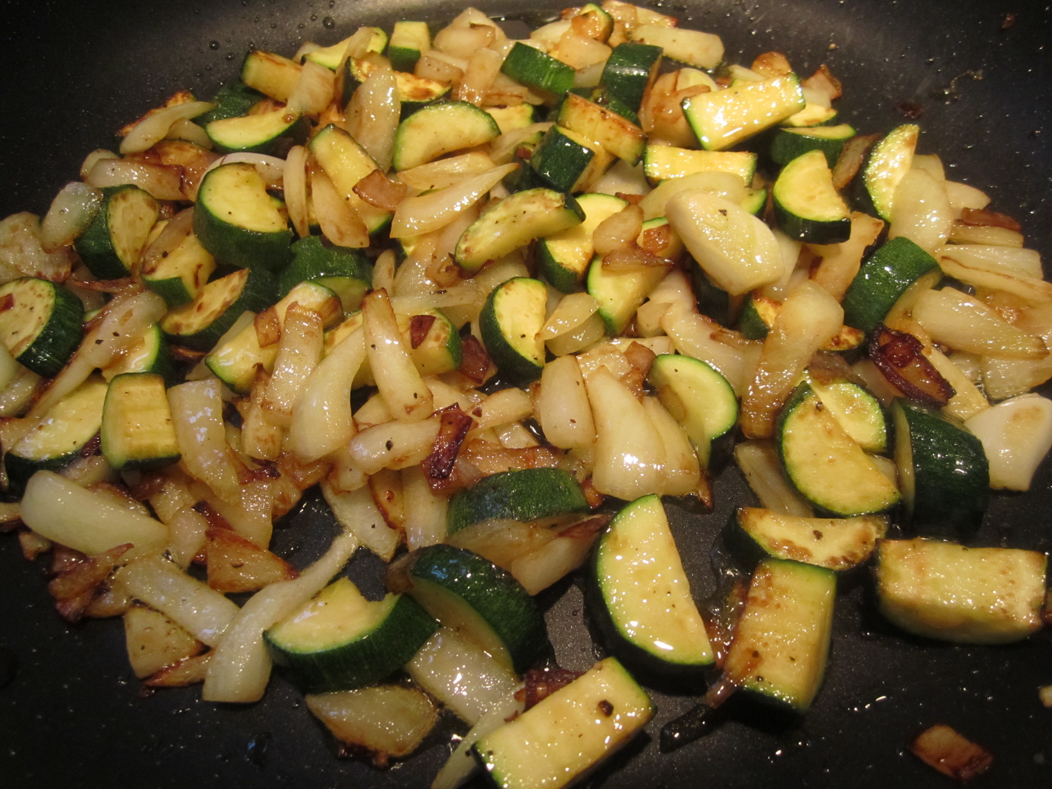 In a broad skillet on high heat, begin sauteing the onion in 3 tbls olive oil, until they begin to color. Add zucchini slices and continue sauteing until lightly golden. Add salt and pepper to taste.