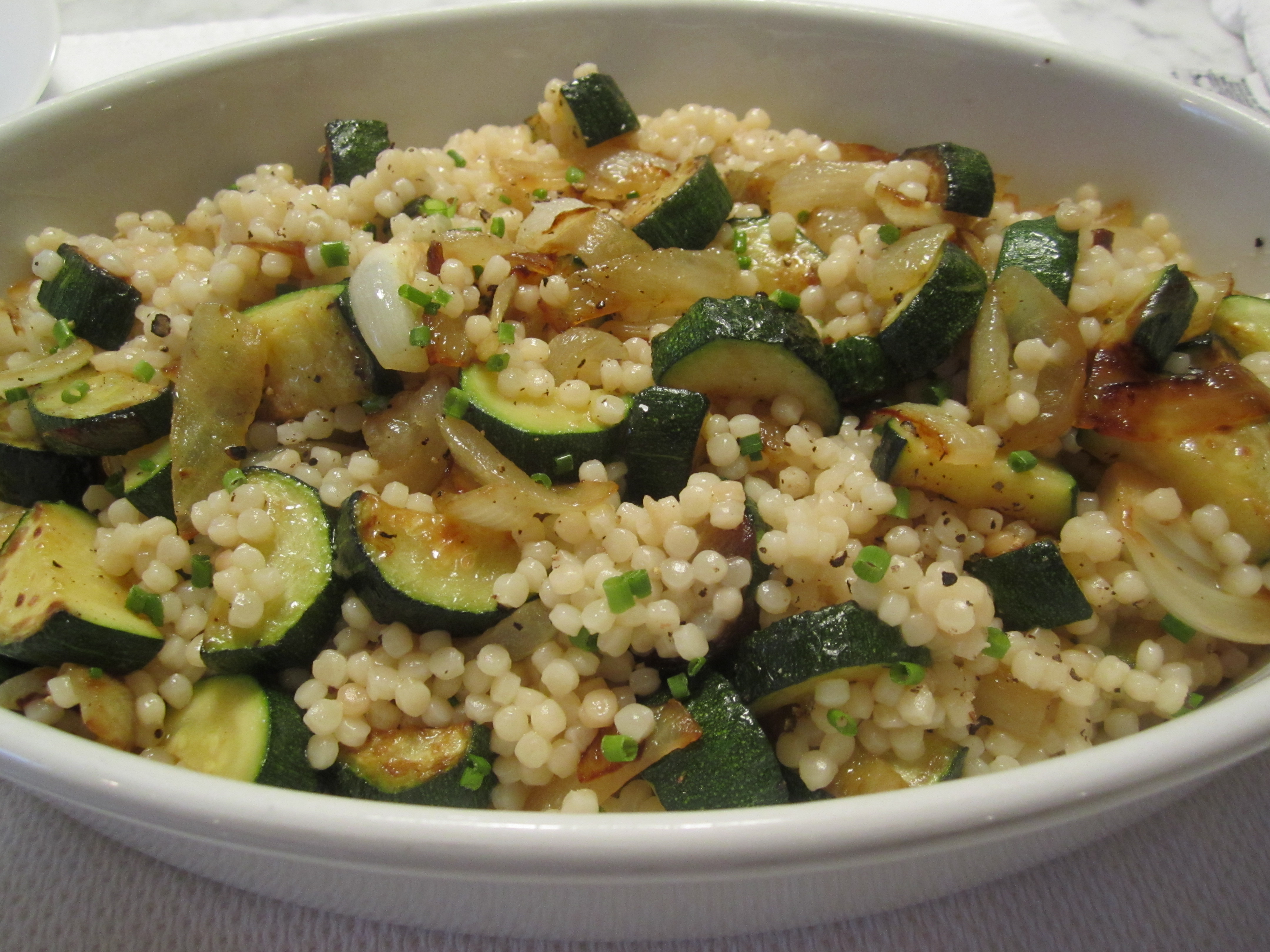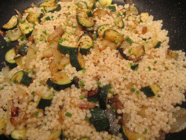 When couscous are done, toss into skillet with zucchini, sprinkle with chives and drizzle with remaining tablespoon of olive oil.