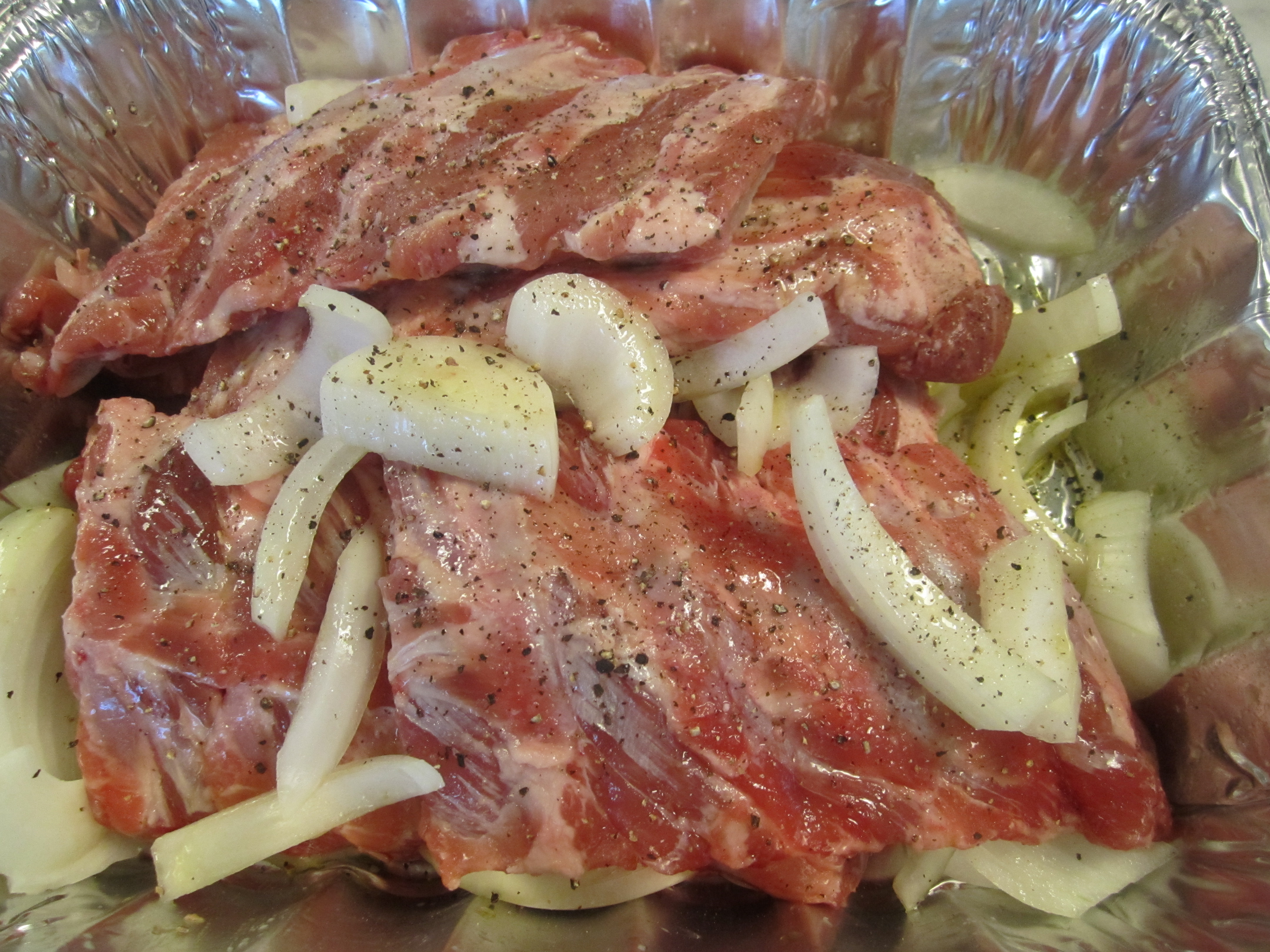 Preheat oven to 325 degrees (or preheat grill, leaving one side of the grill turned off). Season racks of ribs with salt and pepper, then add oil and scatter onions about. Cover with foil and bake for approximately 1 1/2 hours.