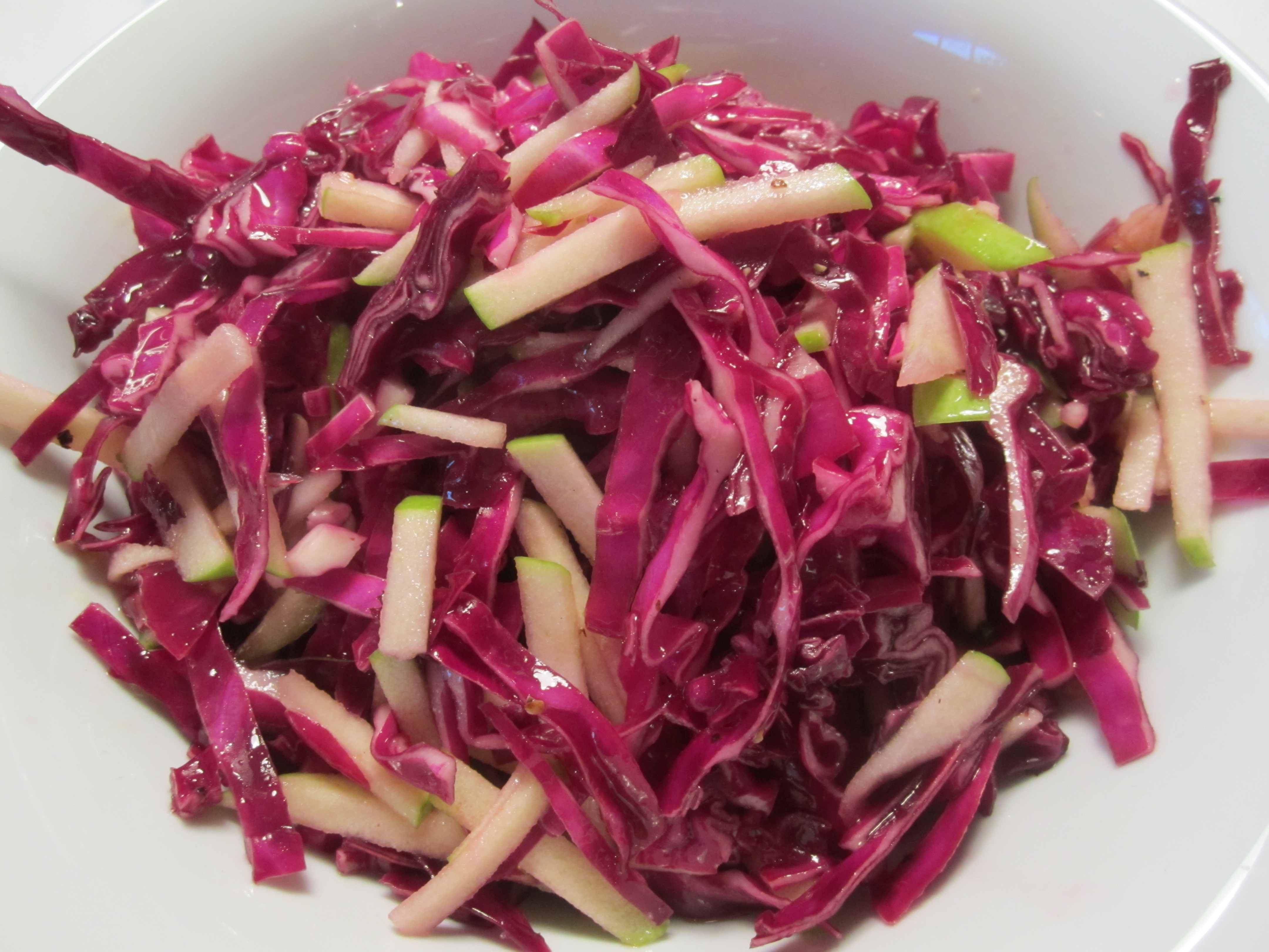 Since I had red cabbage leftover from making my “kale slaw” the other day, I’ve used it to make a variation with granny smith apples. This is as quick and simple to make as any salad.
