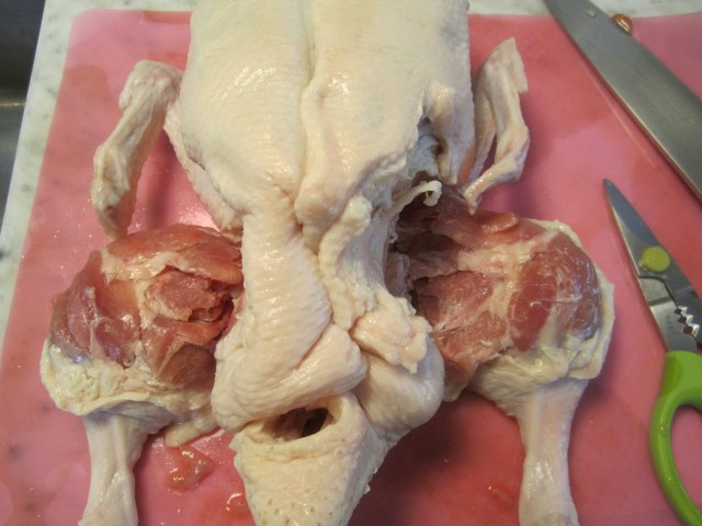 Pull off any thick fat from around the thighs and reserve for the rendering process. Next, remove the breasts by slicing along the breastbone on both sides of each breast. Then gently pull off the skin and reserve.