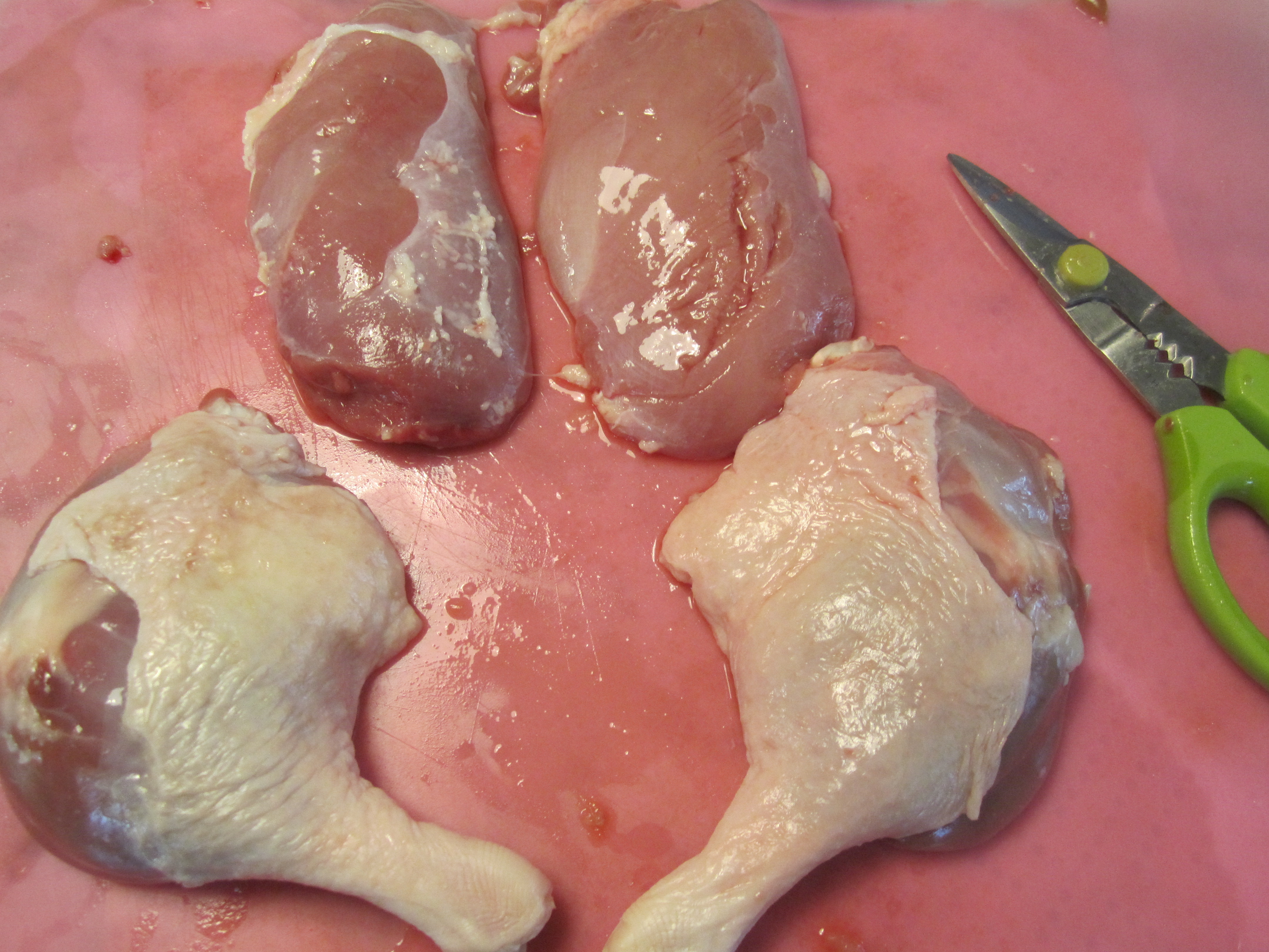 Be prepared for a mess in your kitchen, and have a bottle of sprayable bleach at the ready to wipe down everything in the kitchen after you’re done with the handling of all the raw parts.