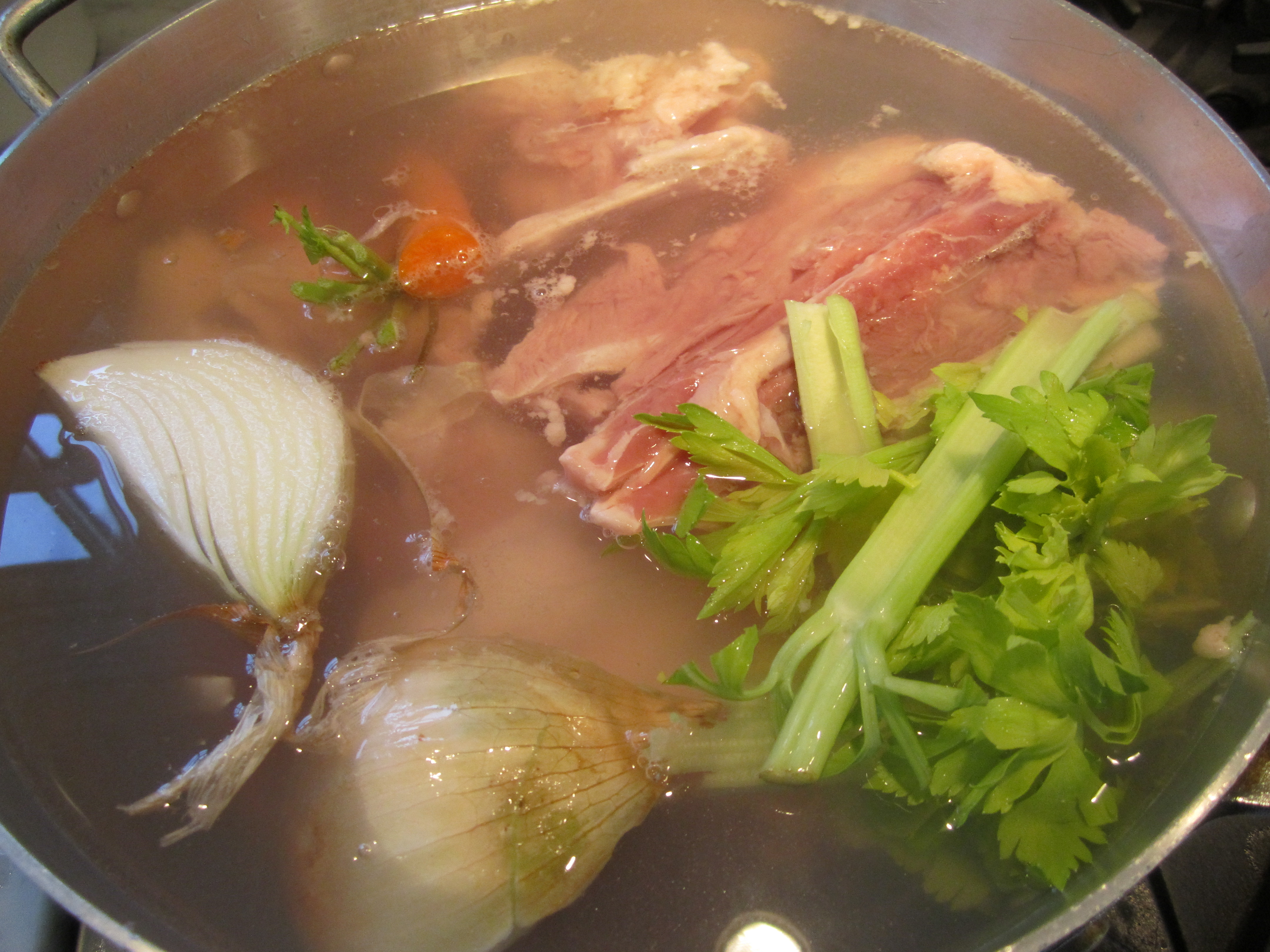 To make the stock, simply place carcasses and necks (if you have them) in a large stockpot and fill with water, a large onion, a carrot, and some celery. Simmer for an hour-and-a-half, removing scum and fat from the surface of the water. Add salt or a couple of bouillon cubes, then cool and refrigerate or freeze for later use.