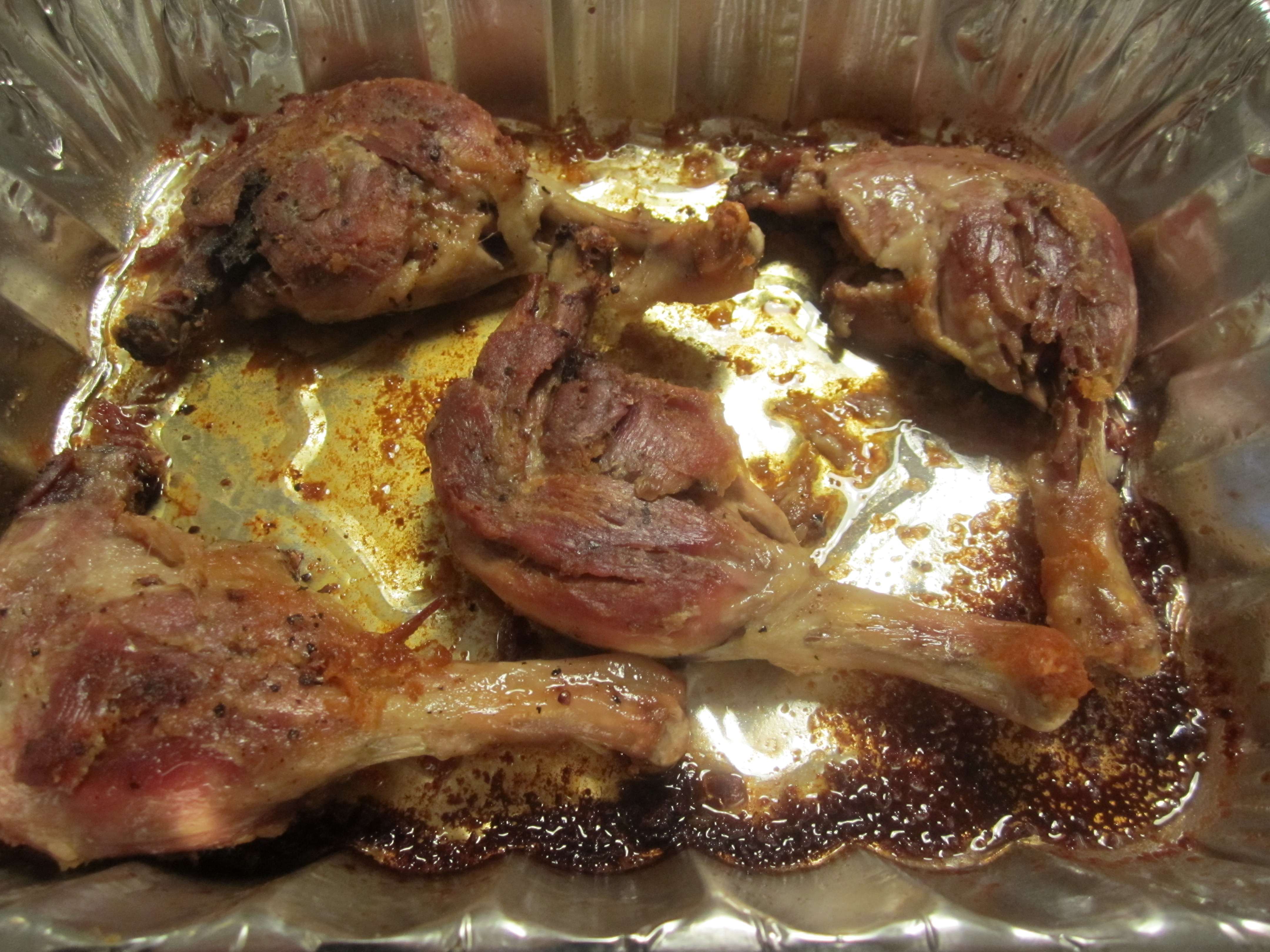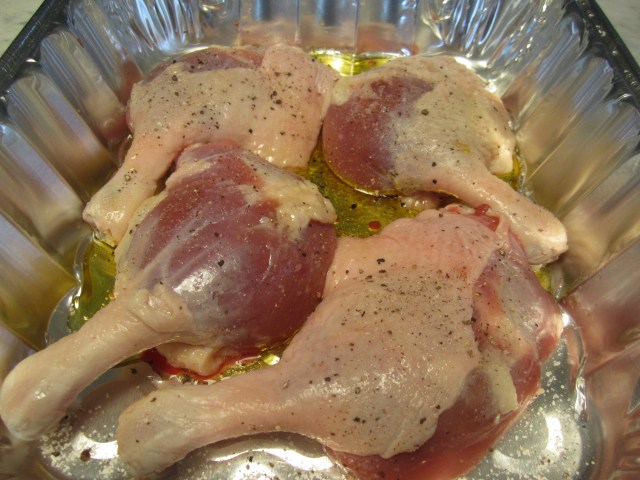 About an hour-and-a-half before dinner, place the covered tray of leg/thighs on a covered grill (or in a 350-degree oven) and roast until golden and crispy. Turn halfway through.