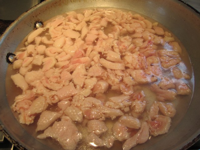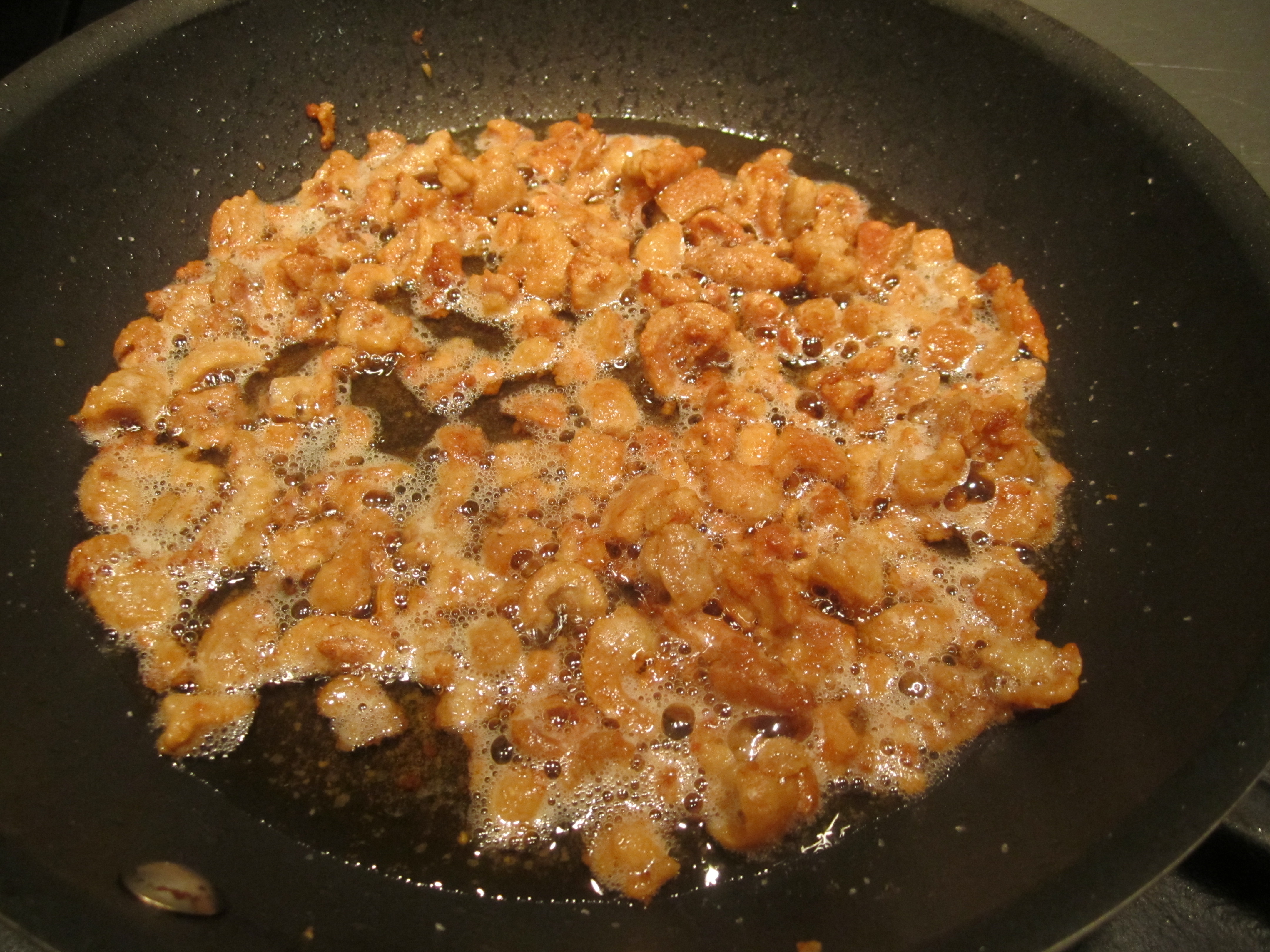 Next, to render the fat from the skin, take all of the skin and fat, and cut into 1″ or 2″ pieces. This requires slow movement with a very sharp knife, slicing back and forth. Place all skin in a skillet and cover with water. On low heat, slowly simmer uncovered until there is no more water remaining–only shrunken pieces of skin and golden duck fat. This can take about a half-hour or so. Pour off the golden liquid through a cheesecloth-lined strainer and reserve the fat for frying potatoes.