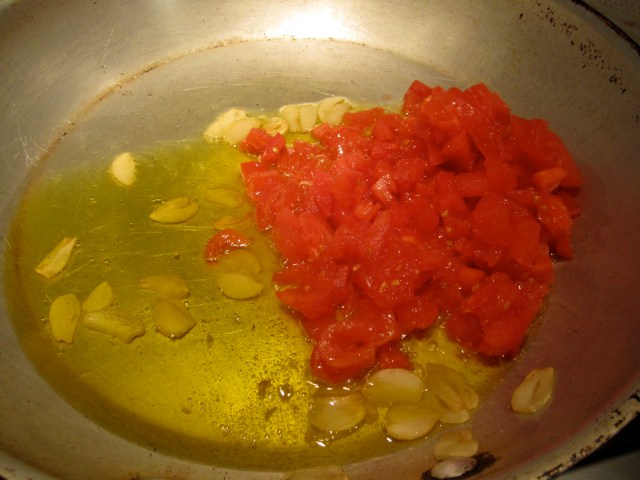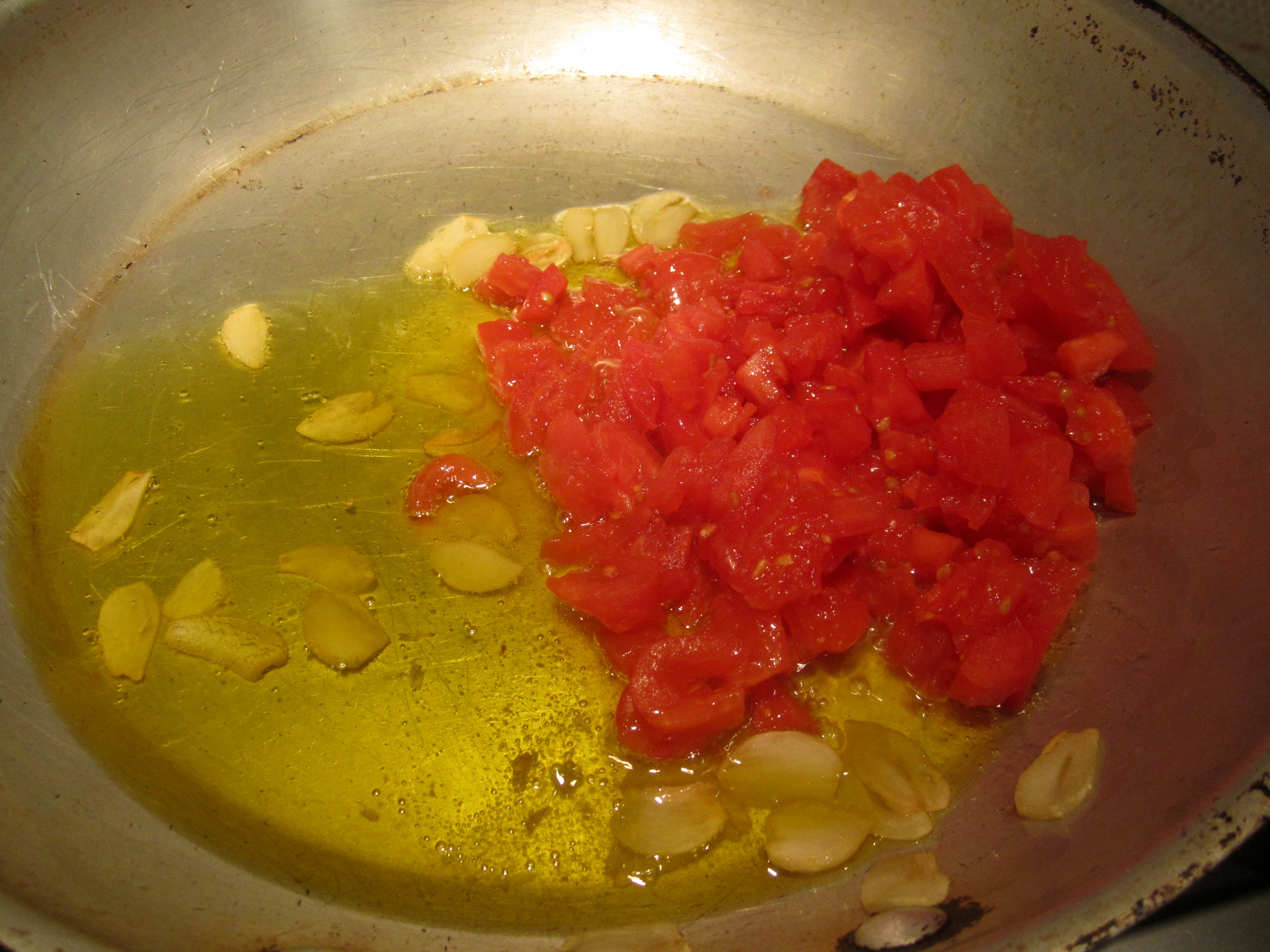 While the pasta is cooking, in a broad skillet, saute the garlic on low heat in 2 tbls oil until just beginning to color. Turn up the heat and add the tomatoes and white wine.