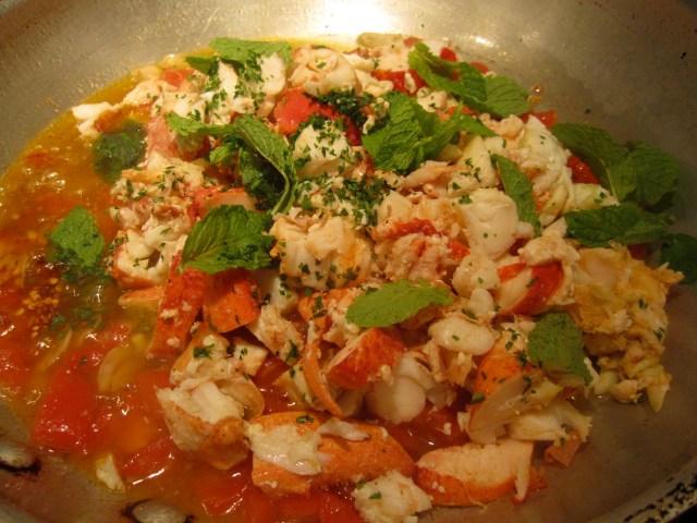 Reduce for a minute, then add the lobster meat. Add the mint leaves, chili flakes, and heat very gently until the pasta is done (you don’t want to toughen the lobster meat–just heat it through).