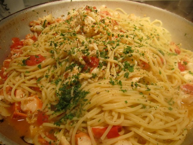 Whether to use fresh pasta or dried is always a question. I’ve tried both fresh and dried, and I think that dried is more appropriate for this dish. It’s essentially an oil-based sauce with a touch of tomato–fresh pasta ends up being too delicate for this sauce.