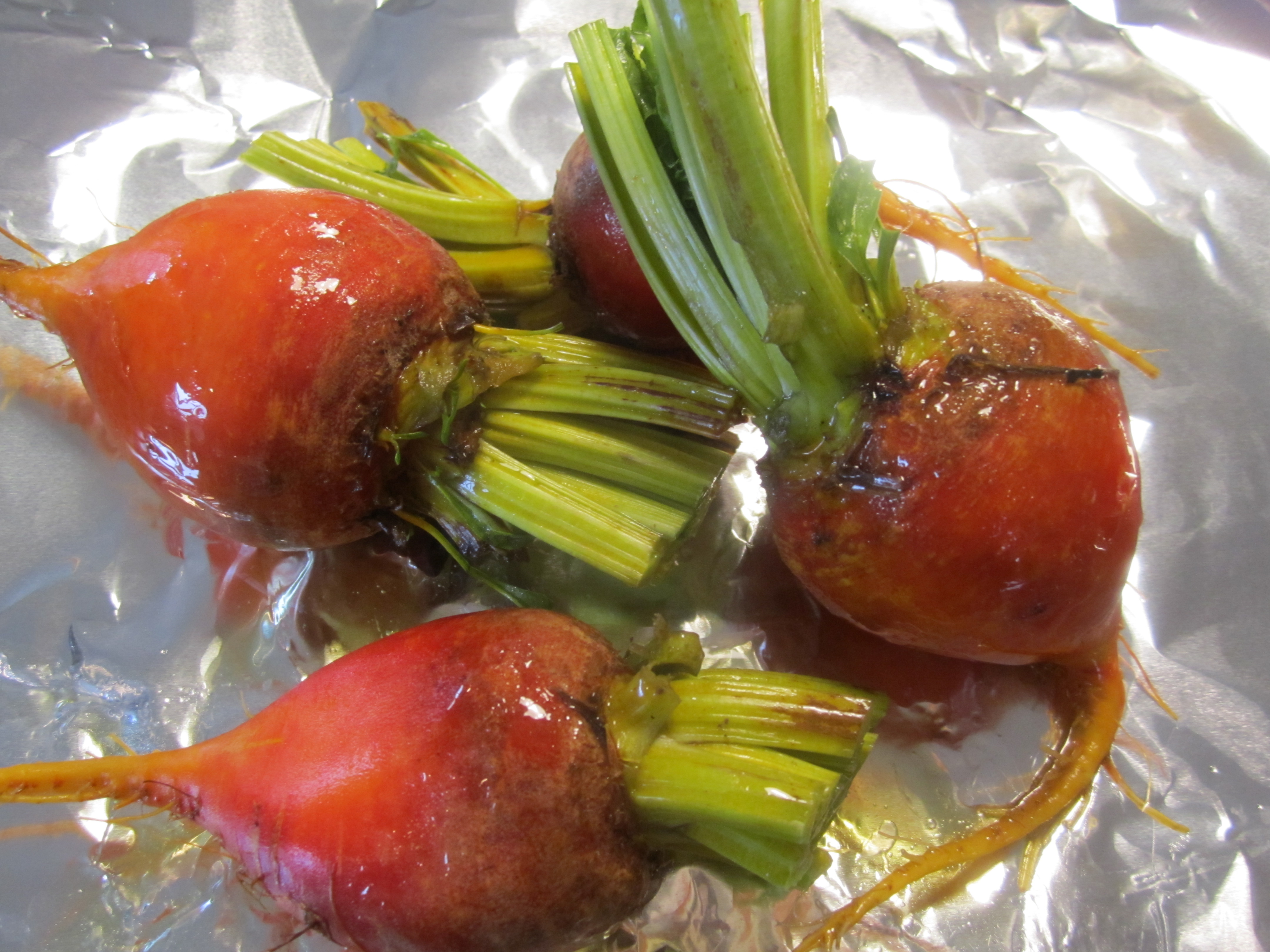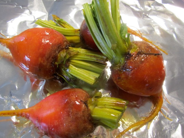A couple hours ahead, preheat oven to 375 degrees. Wash beets, place them in foil and drizzle lightly with olive oil. Seal and roast for 1 – 1-1/2 hours, depending on their size.