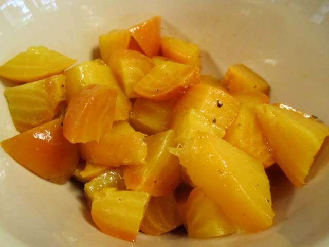 This may look like many other salads on this blog but it’s summer and it’s all local and just-picked. These exquisite golden beets elevate this salad to an other-worldly level of goodness. They’re so naturally sweet that it’s difficult to go wrong in their preparation.