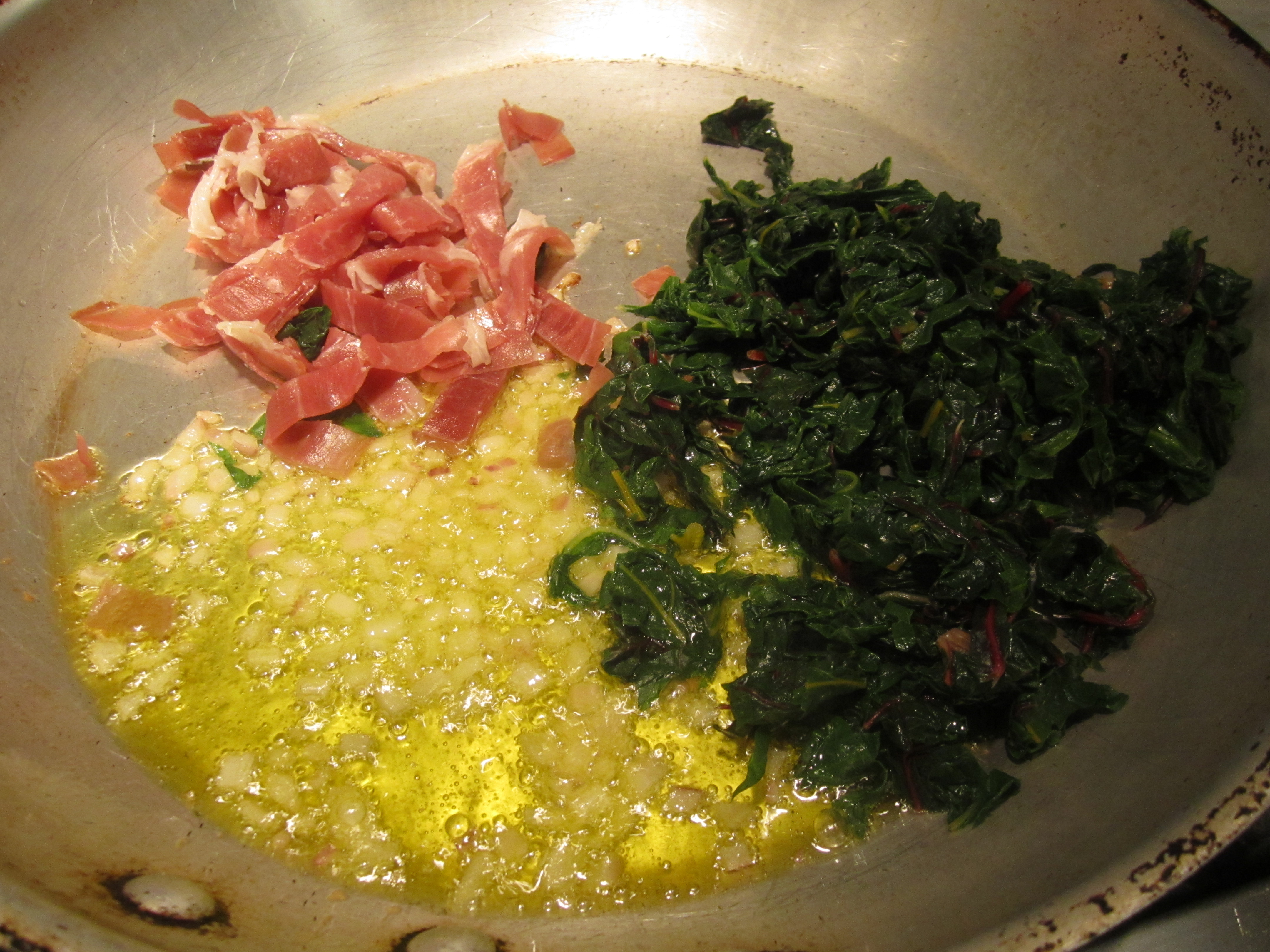 While pasta is boiling, in a broad skillet, saute onion in oil until translucent. Add the prosciutto and swiss chard and saute on medium heat for 2 or 3 minutes