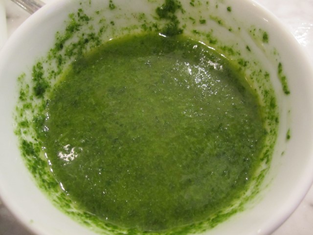 This sauce, however, is a variation on a condiment we used to make at Po Restaurant–green oil. Green oil was more of a garnish on the plate, rather than an actual sauce. It was made by processing parsley and a few spinach leaves with lots of oil, then straining. It made the brightest greenest streaks on almost every plate that was served at Po.