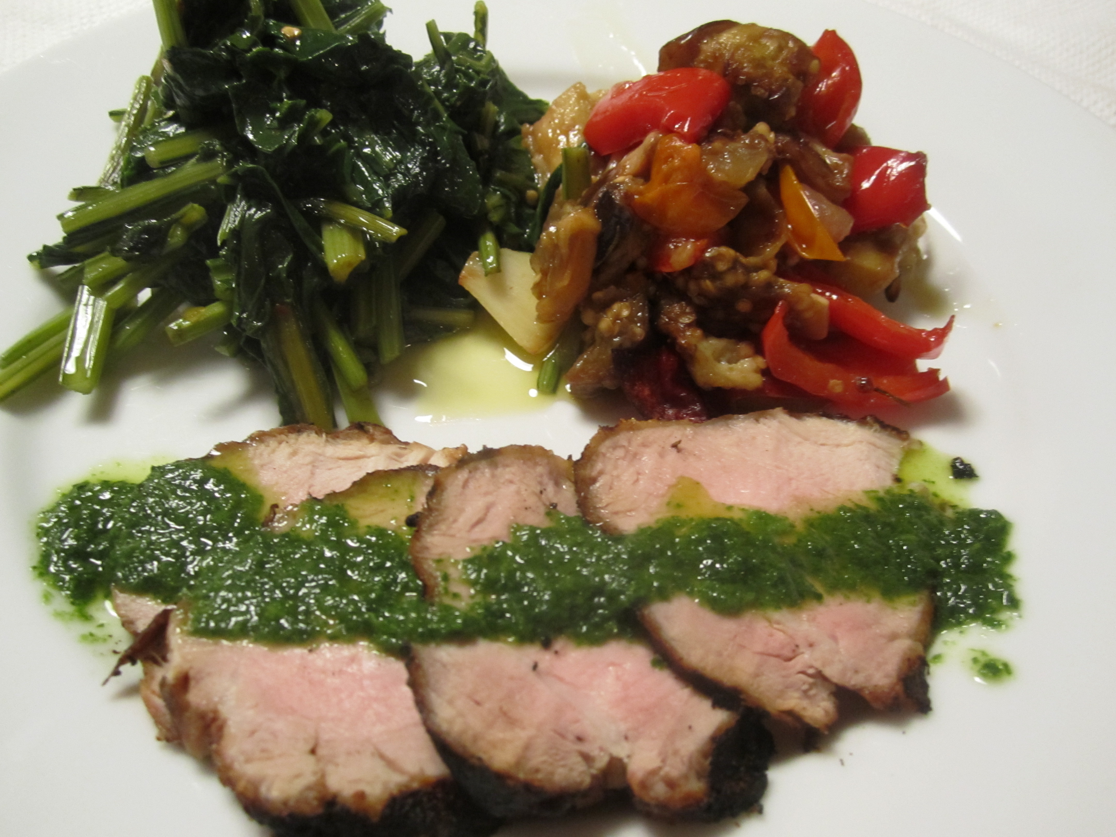 The tenderloin was grilled earlier, to be sliced thin and served at room temperature. I made the green sauce simply to liven it up and it was brilliant–it also tasted great with everything else on the plate.