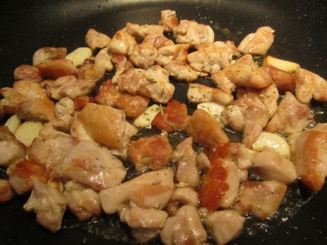 In a broad skillet, saute chicken 4 tbls olive oil until lightly golden. Add garlic and rosemary and continue sauteing until garlic is golden.