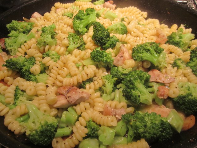 This dish begins with dicing boneless, skinless chicken thighs (chicken sausage is great as well), then browning in a skillet with garlic. The blanched broccoli is added and sauteed with the chicken and garlic, and all is tossed with pasta and plenty of extra-virgin olive oil. Grated pecorino is great sprinkled on top as well.