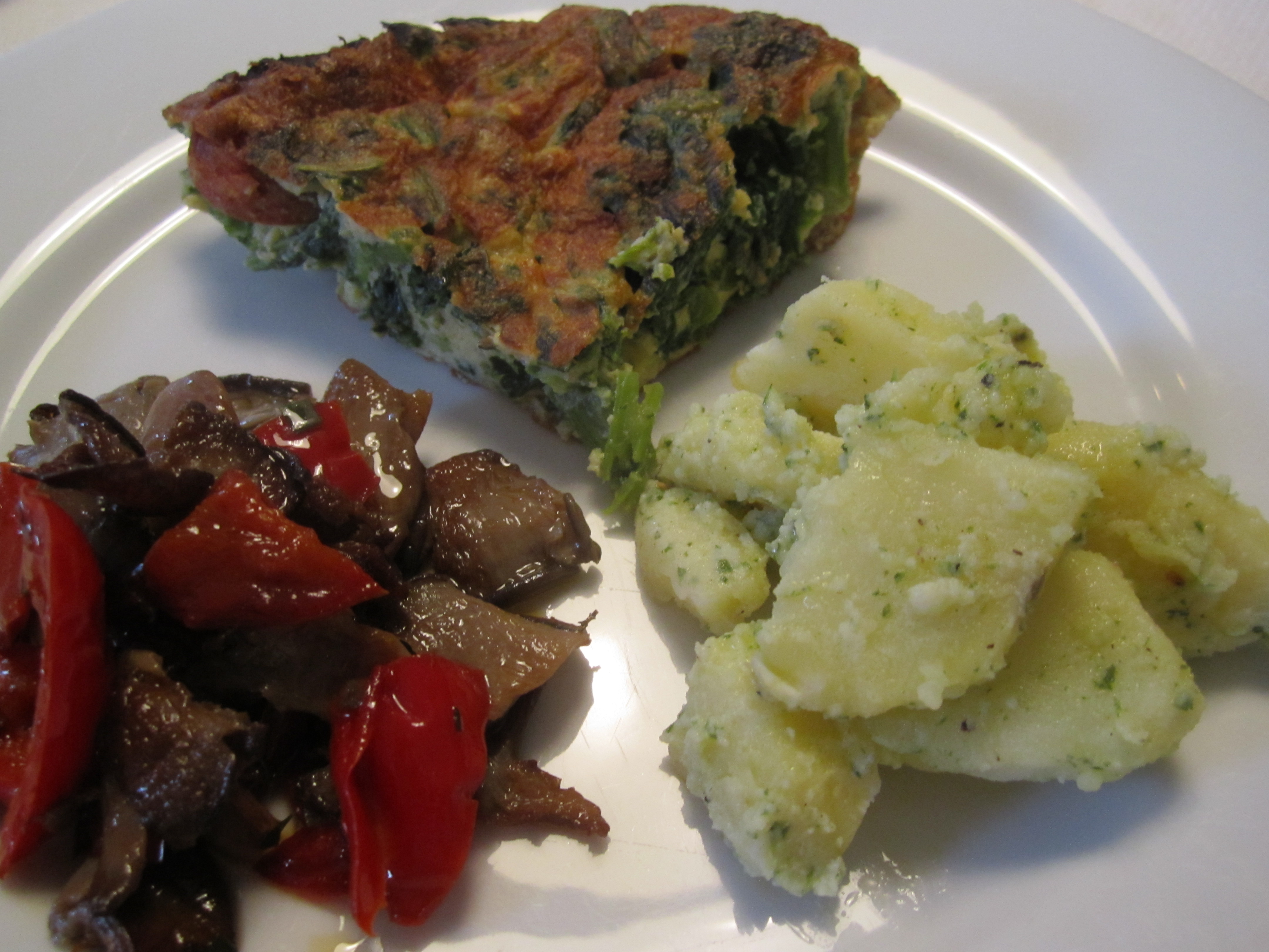 In addition, I have some great side dishes leftover from my grilled swordfish meal the other night–potatoes with green sauce and oyster mushrooms with red peppers–all served at room temperature.