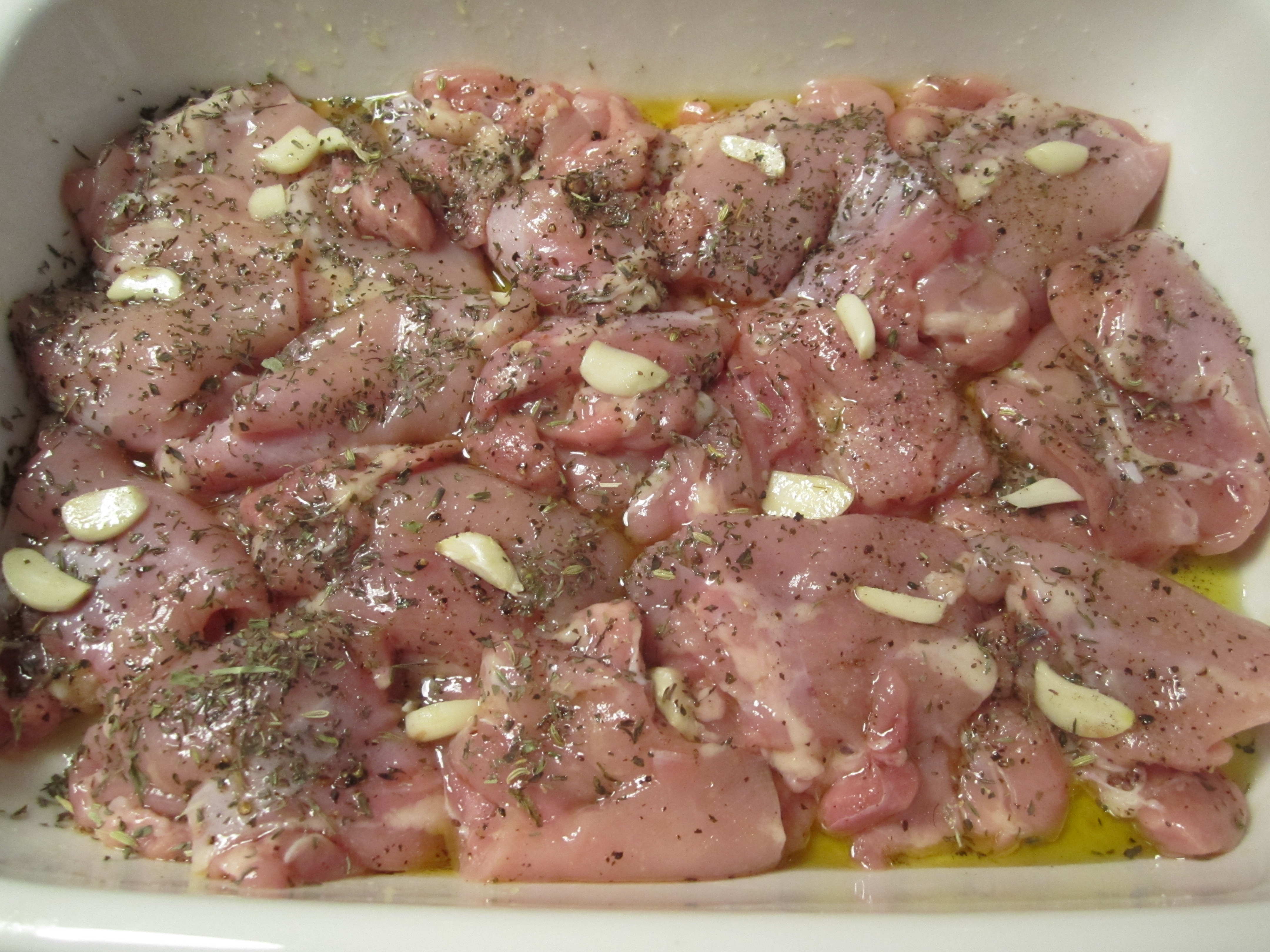 I simply rub them with some herbs–tonight I’m using parsley, rosemary and fennel seeds, as well as some sliced garlic and olive oil. I don’t hesitate to salt my poultry ahead, so I’ve given it a generous sprinkling of salt and black pepper as well.